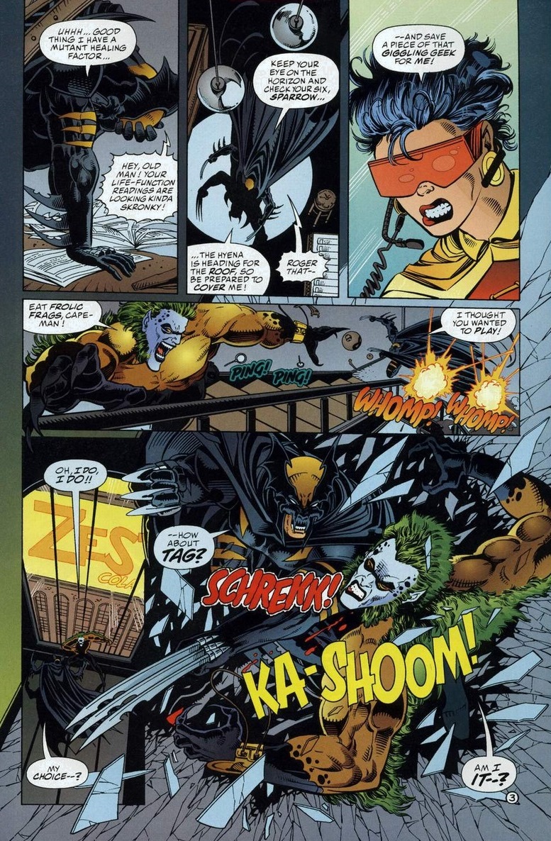 While Robin takes some time to learn about Jubilee’s fetishes, I can’t stress enough just how insane this crossover event becomes. It’s great. Situations that have never occurred in comics and never will again pop up on every other page. Want to see Peter Parker flirt with Lois Lane? I’m about to show you. How about Dark Claw (Batman merged with Wolverine) fighting Hyena (Joker merged with Sabretooth)? Yes, it’s amazing.