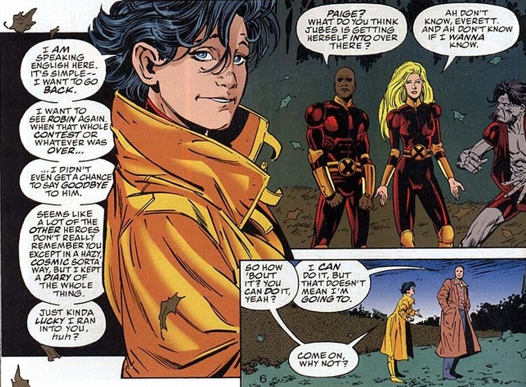 By the way, those Amalgram combo-superhero issues? They made 24 of them. The ’90s could be a wacky time for comics. But as we jump back to our sorta-love story, we pick up a year later in the sequel. The superhero Access (real name Axel Asher) has the superpower to travel between DC and Marvel. That’s his sole purpose for existing, and Jubilee wants to abuse that power.