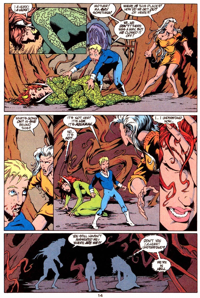 Posted: 11/30/2014 Filed under: DC, Relationships 6 CommentsAquaman continues with his merry wet life after Mera accuses him of having weak genes, murdering their child, and then whirlpooling away from him forever and ever. And in the mid-1990s, because everything had to be extreme with lots of ‘tude, Aquaman received a makeover as well. He no longer wears a shirt, had one of his replaced hands with a hook, and grew a beard to show off his shirtless hook-hand ruggedness. But today in Aquaman #11-15, written by Peter David and drawn by Marty Egeland & J. Calafiore, that painful reminder of his past (Mera) returns once more for a weird story involving multiple dimensions and demons and alternative Aquamans. But first, this: