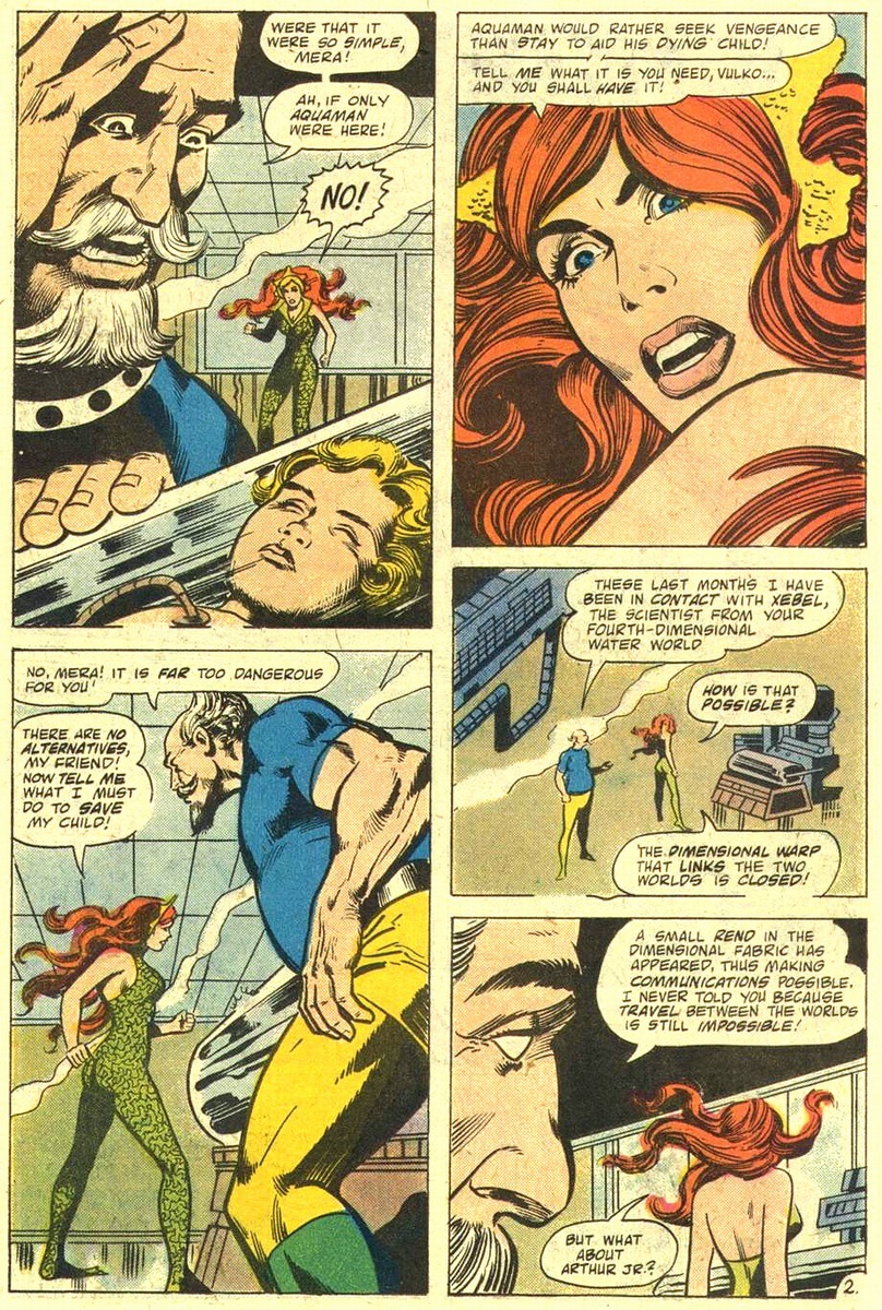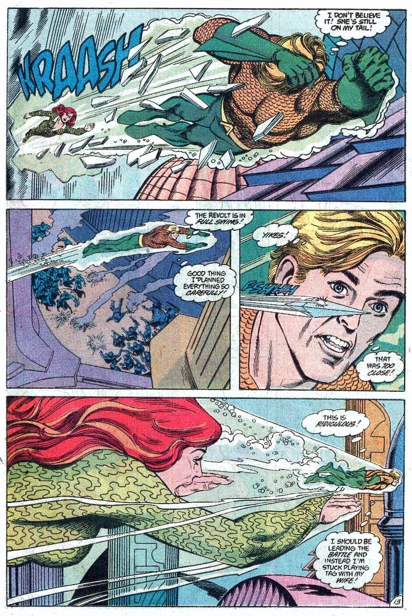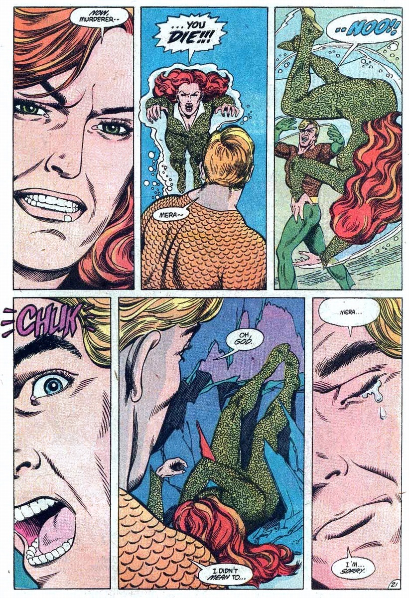 The cover of Aquaman #62 is that super famous one I’m sure you’ve seen before. It’s when covers were not just pictures of the starring superhero lying unconscious in front of a sneering adversary. No, they had stuff like words on them to unnecessarily increase the melodrama to an uncomfortable level of disbelief. Also, this is the point where Mera starts to lose it. Watch the difference between her and her husband.