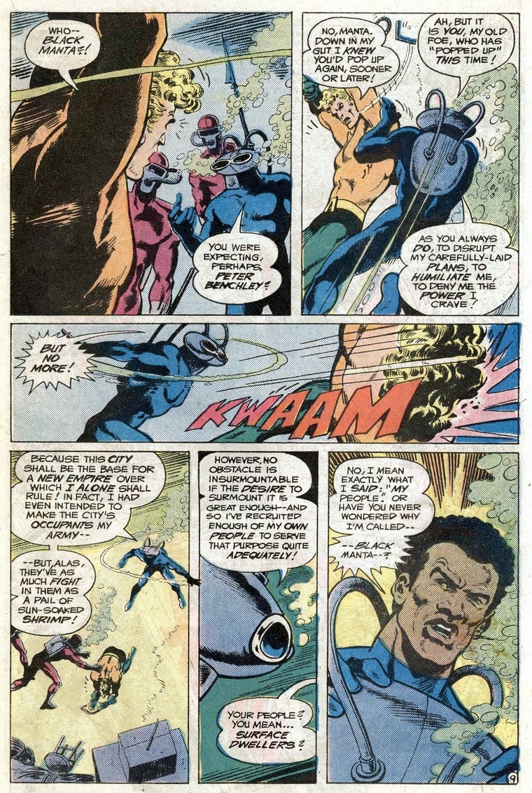 We jump back to the late ’70s, deep in the Bronze Age of comics, which is like the Silver Age just with a slight shift in more “adult”/socially-aware plots. Not porn, but more like the writers and artists dipping their toes in the pool of dark grittiness before submerging and consequently drowning themselves in that pool during the late ’80 and early ’90s. And we start with the perfect example of the socially-relevant Bronze Age — Black Manta, Aquaman’s arch-nemesis, reveals his face for the first time in comics: