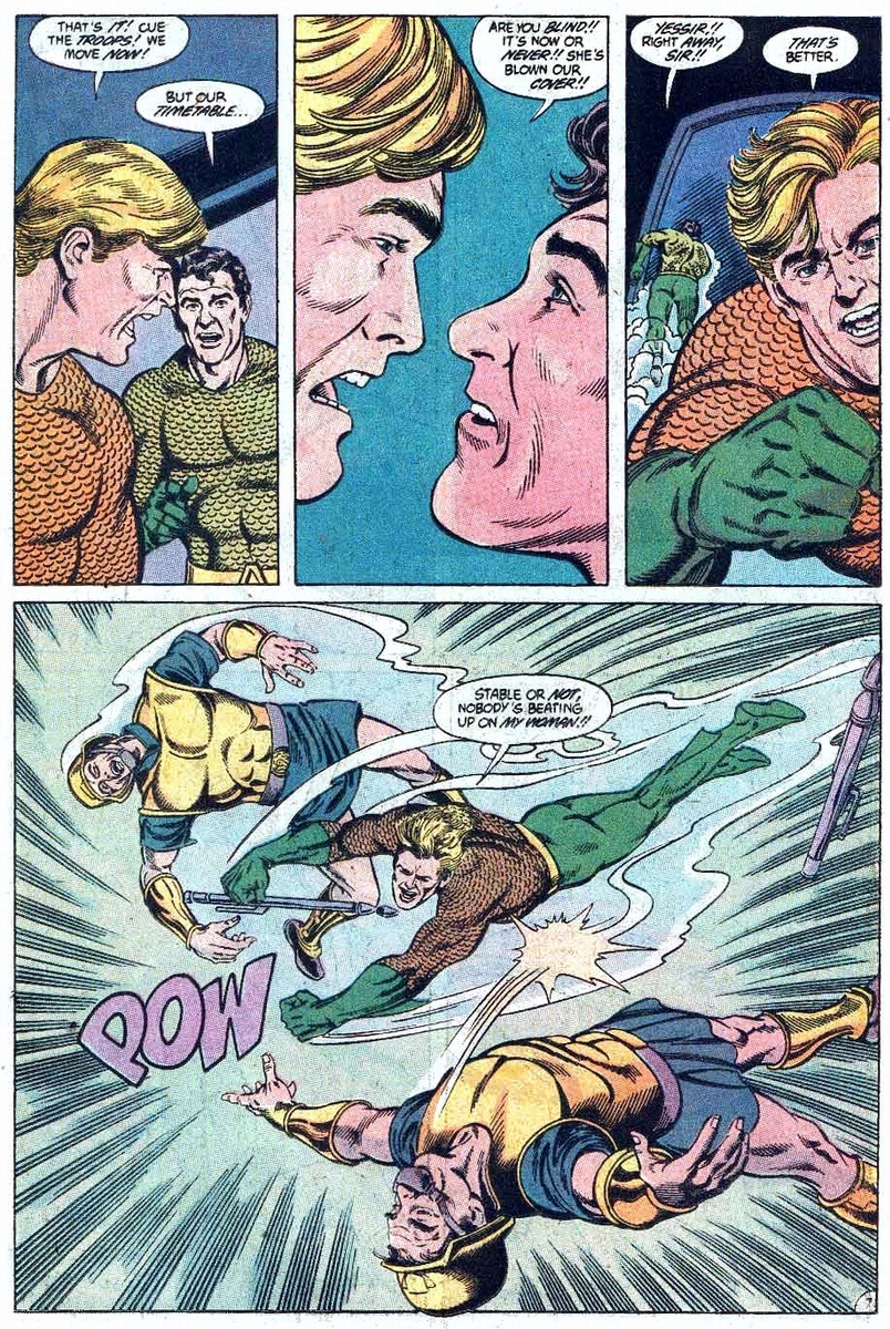 We’re in the late ’80s, eleven years after Part 2. Our story took a eleven year break — or the amount of time it took for Aquaman to get another solo series after his previous one wrapped up in 1978. Currently, underwater war: