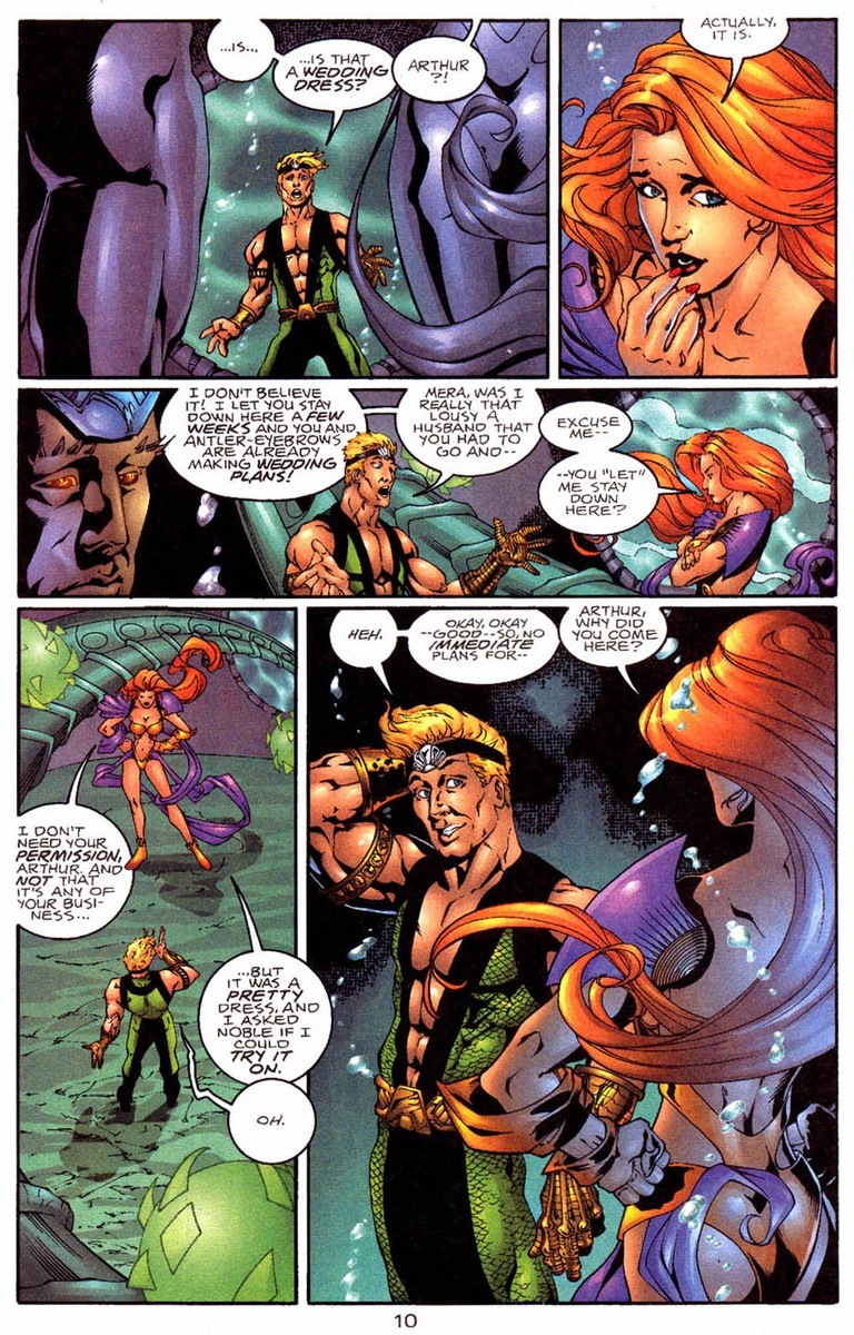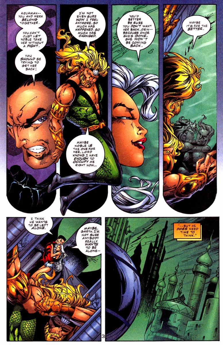 Posted: 12/02/2014 Filed under: DC, Relationships 2 CommentsIt took nine years to get these two back together after their marriage imploded, not that Aquaman stayed chaste or faithful or didn’t nail hordes of beautiful sea-women. But in 1998, thus began the fifteen issue long will-they-or-won’t-they games that elevate comic books to essentially soap operas with punching. Don’t get angry — we love the drama (and the punching). So today we begin their journey back in love from various scenes in Aquaman #47-62, written by Dan Abnett, Andy Lanning, Erik Larson, Chris Eliopoulos, & Gary Carlson and drawn by J. Calafiore, Eric Battle, & Mike Miller. Also note the massive amount of writers and artists if you detect any tone changes.