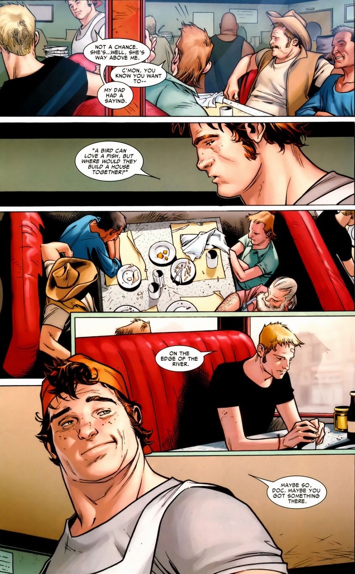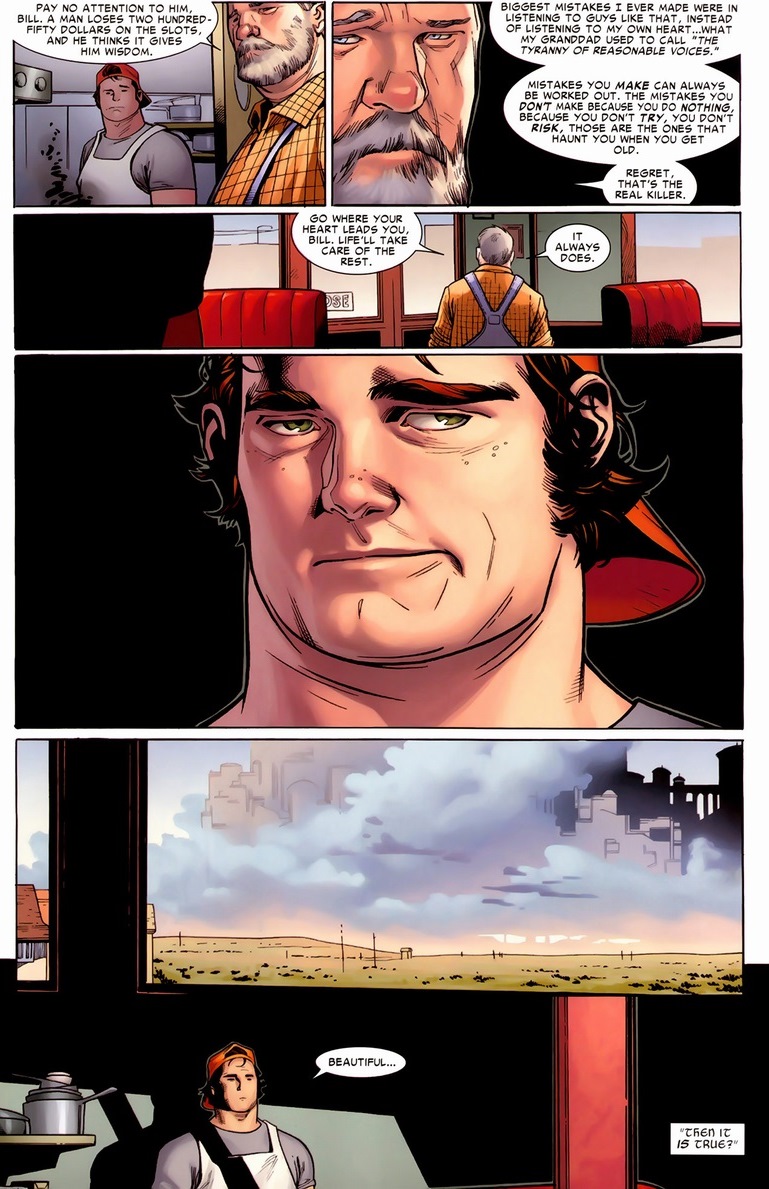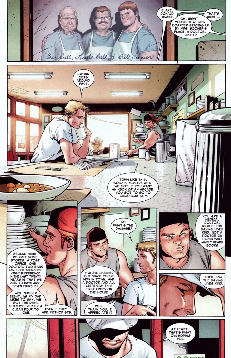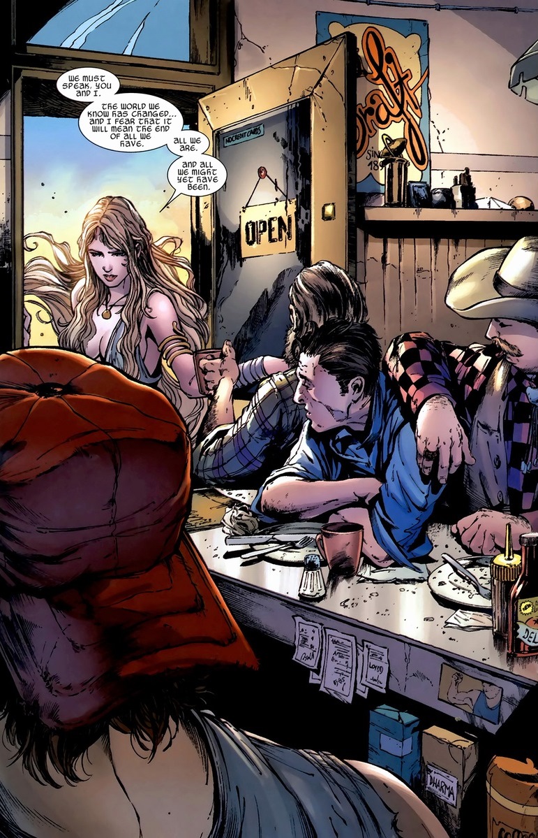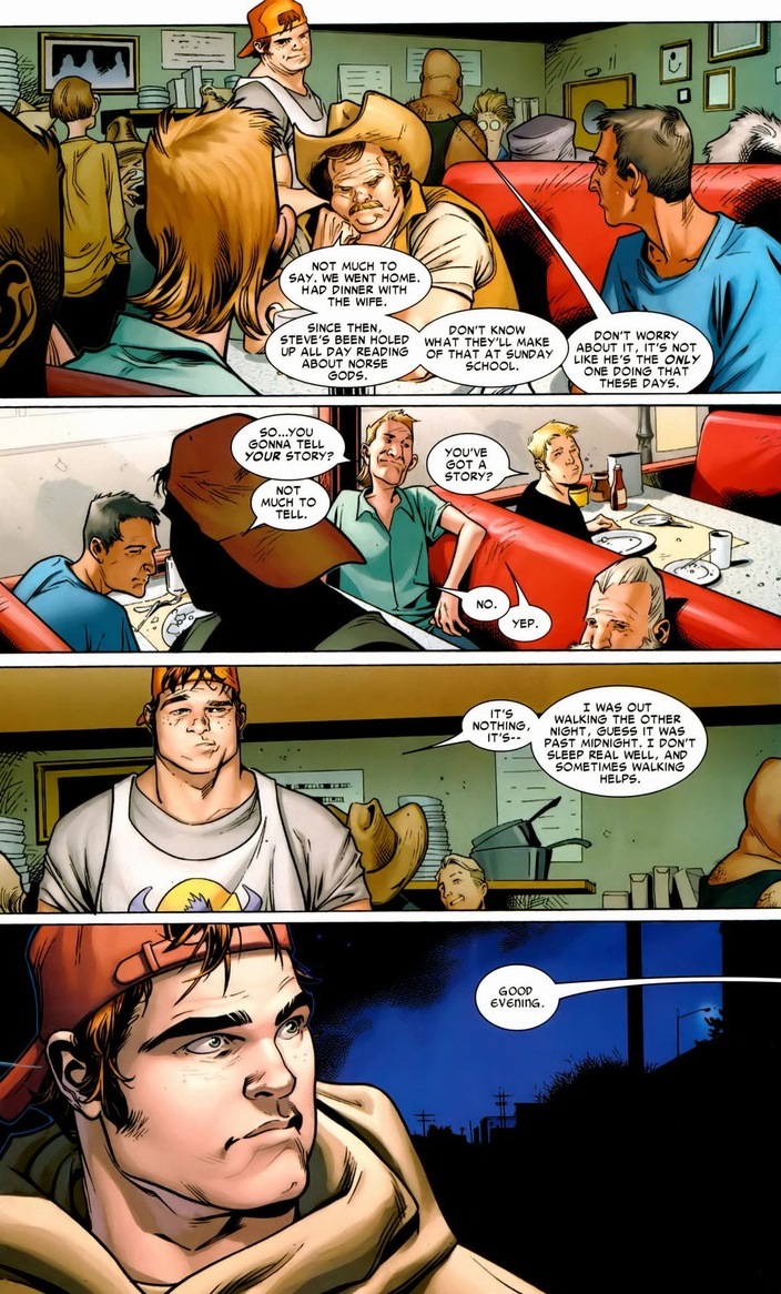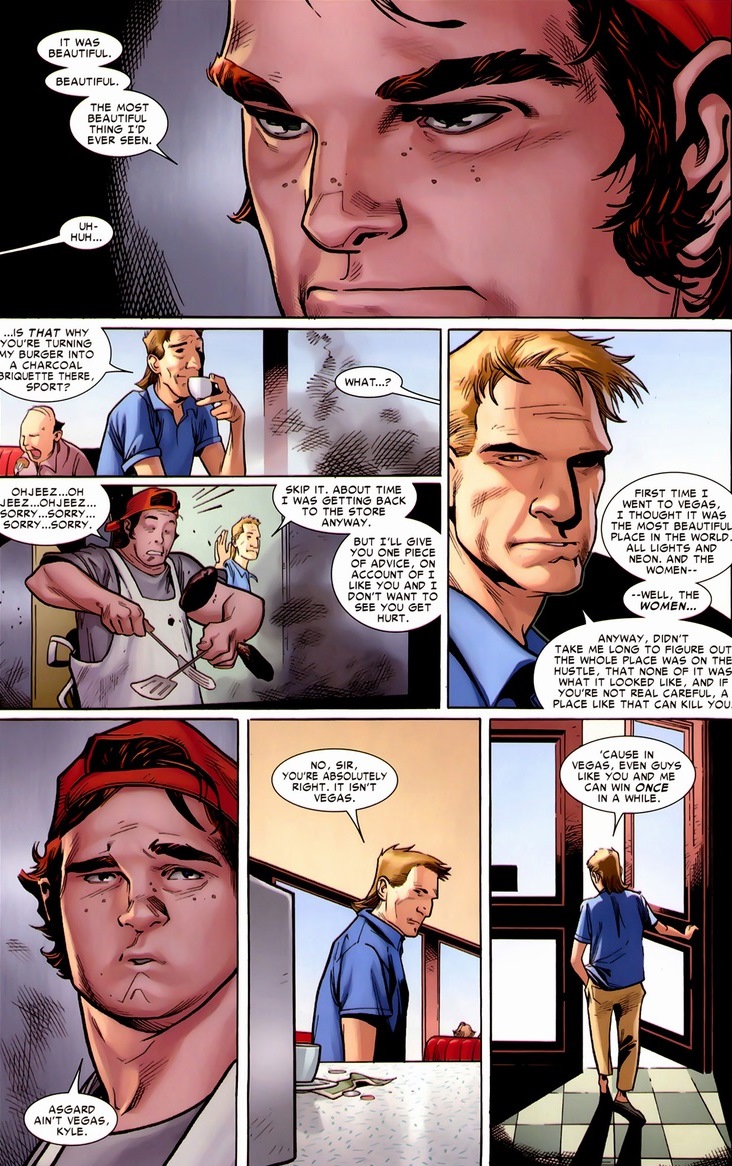 Luckily, Thor/Blake returns to life and decides to bring Asgard to Earth (Midgard). So they do, right next to a rural town called Broxton in Oklahoma. In quite possibly the greatest Thor stories ever told, Straczynski (and later Gillen) revives all the gods, presents a new status quo for Thor and friends, famously allows Thor to have some “words” with Iron Man, resurrects a wonderfully conniving Loki, and so much more. Oh, and most importantly, we meet some new characters, like local diner cook Bill Cobb Jr.