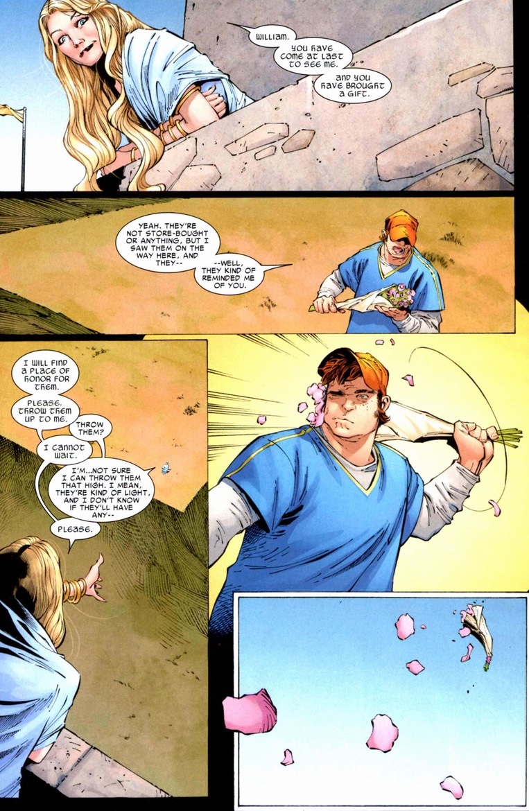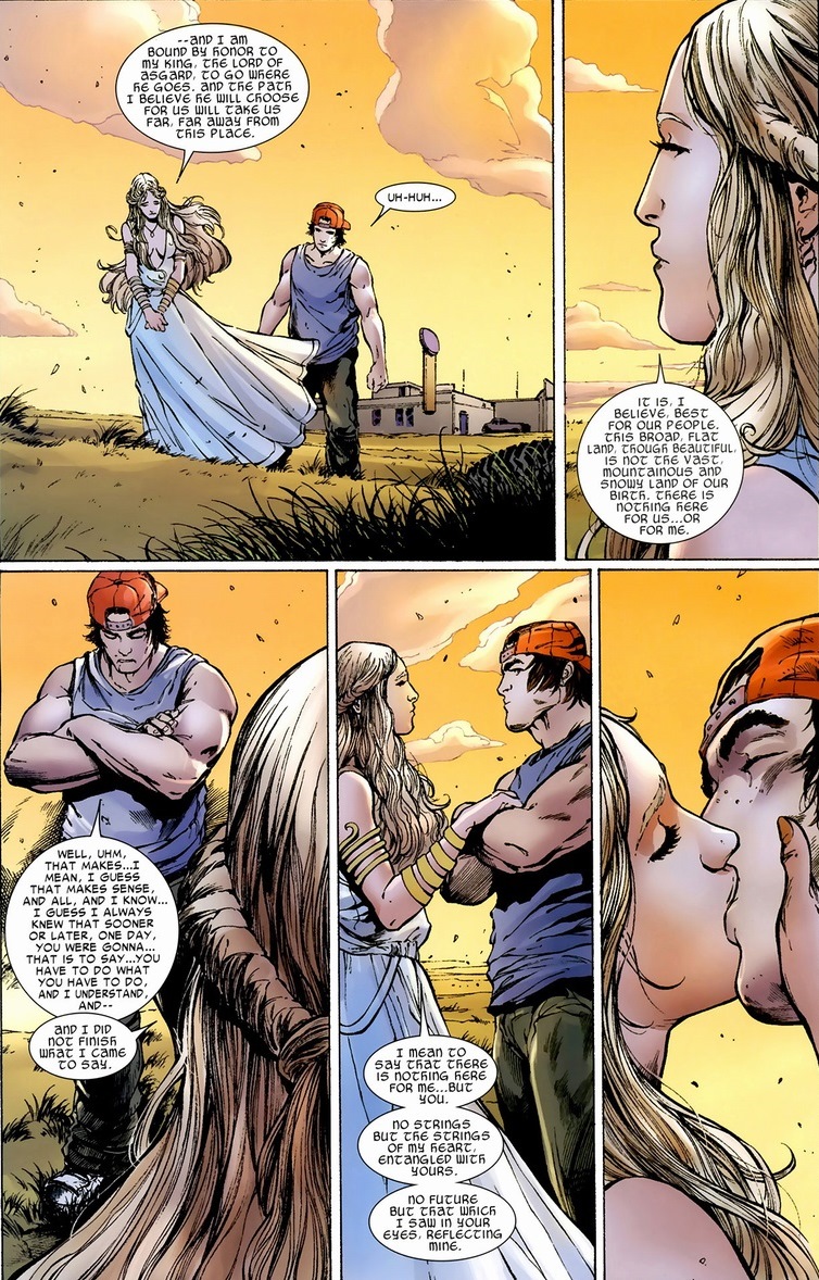 Don’t be afraid to root for Bill. Despite the trademark backwards baseball cap, this man’s a proper southern gentleman. The dude’s fearless around nine-foot shirtless gods and equally romantic around his gorgeous Asgardian crush. But yet Bill fails to make a move. If an eternally youthful, prettier Iceman falls for him, why should he hesitate? Intimidation, I’m sure, but at least for Kelda’s sake I imagine it’s just nice to have a man treat her with a compassion the nine-foot shirtless gods rarely do. Though honestly, I think Bill just chickened out: