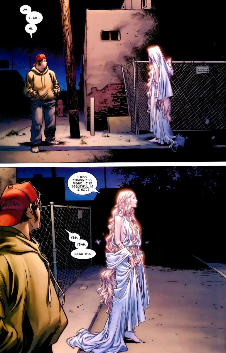 There’s a beautiful dynamic in Straczynski’s new Asgardian home — the small town folks who have probably never ventured far from their hometown now work and live alongside actual living, breathing gods. So when Bill wanders around at night, the people (immortal gods) he’ll meet could be anyone’s guess. Thankfully, he meets this one: