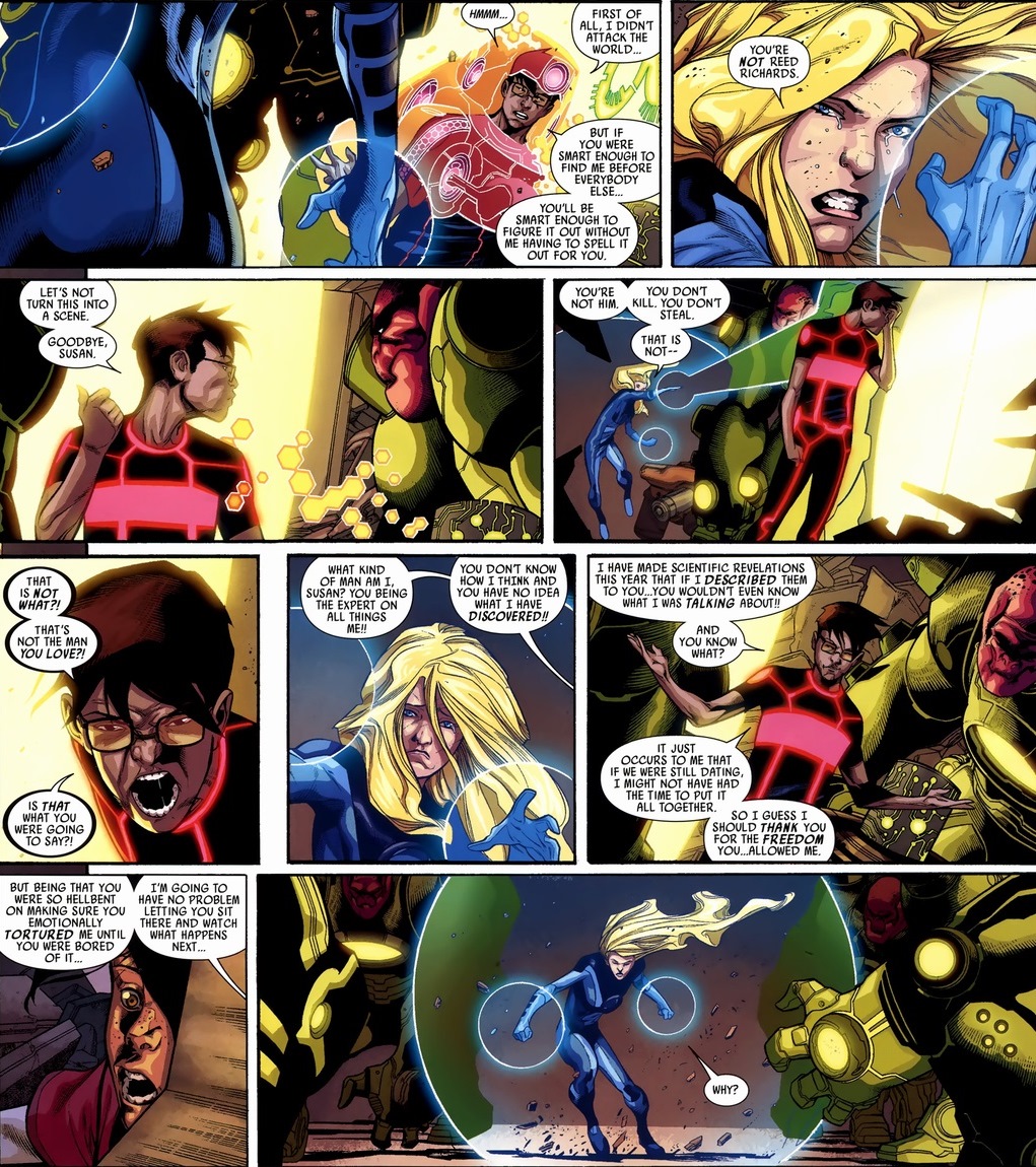 After the Invisible Woman leaves to go collude with other criminals, Mr. Fantastic goes about his usual business. Y’know, helping Iron Man destroy anything resembling a former friendship.