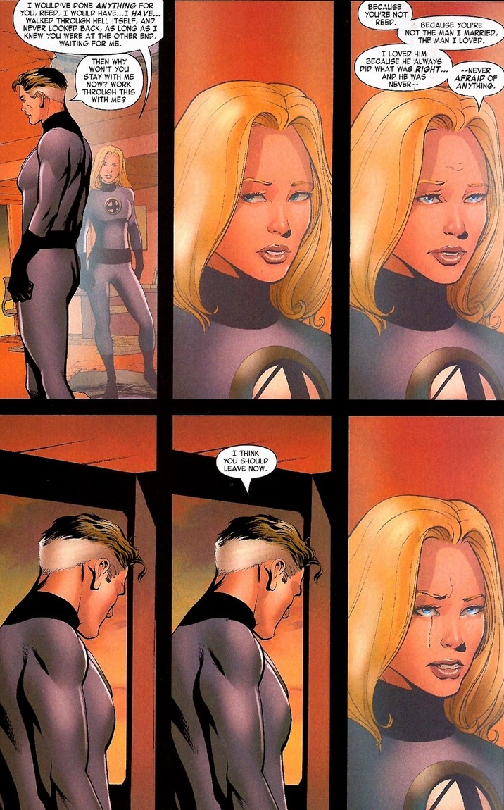 Let’s talk about Sue’s argument. The Holocaust point doesn’t really hold up, because once superheroes register with the government then they have free rein to go about their happy, law-abiding business. Also, very few Jews can bench press trucks or spout adamantium claws from their hands. But Reed’s “I’m protecting you!” argument also comes out as a pathetic lie the moment the words leave his mouth. Both are wrong mainly because the Civil War sits caked in heavy coating of gray area, but Sue did touch upon something that holds absolute truth: no supervillain in the world can break up their marriage, but that doesn’t mean it can’t be bent from within.
