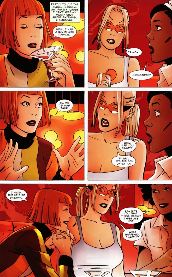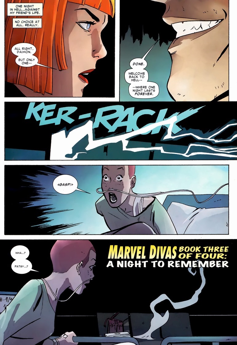 But we know the morbid finale to their tale. Hellstrom’s mischievousness lives on as he continues to manipulate living playthings while Walker has to rebuild her life from scratch after being trapped in Hell for years. Normal divorce stuff, and most importantly, Walker begins a new life sans-Daimon Hellstorm. Unfortunately, she can’t completely escape her past in the miniseries Marvel Divas #1-4, written by Roberto Aguirre-Sacasa and drawn by Tonci Zonjic.