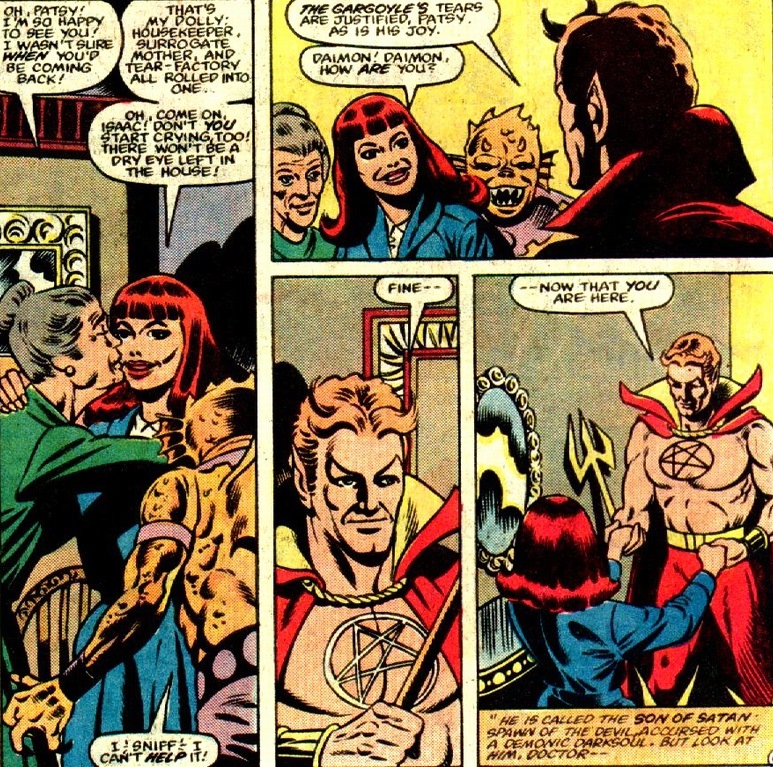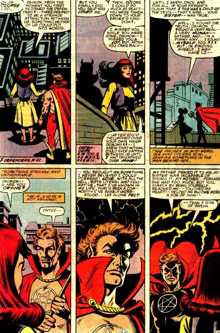 Posted: 01/29/2014 Filed under: Marvel, Relationships Leave a commentI’m not saying that Hellcat and Daimon Hellstrom’s marriage wasn’t going to work out (real names Patsy Walker and Daimon Hellstrom respectively), but one’s a former fashion model and the other’s the Son of Satan, evil incarnate. Still, there’s no reason the romance couldn’t play out in standard comic book drama, like in Defenders #116, written by J.M. DeMatteis and drawn by Don Perlin.