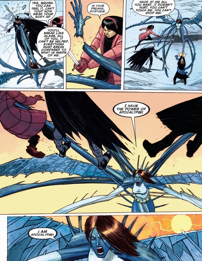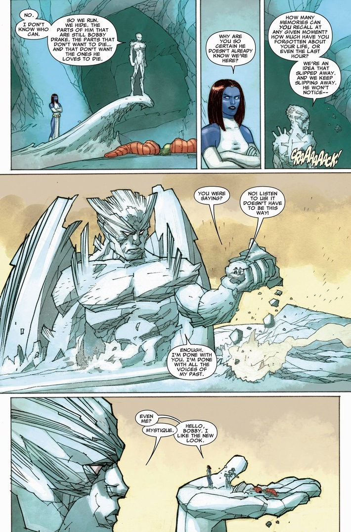 If you read the dialogue again, Mystique tells not one lie. She just meshes easier with supervillains, which currently describes huge winged Iceman. Though dear Mystique has the same personality mishaps that all Marvel characters possess, at least her desires never change. She only wants one thing: everything.