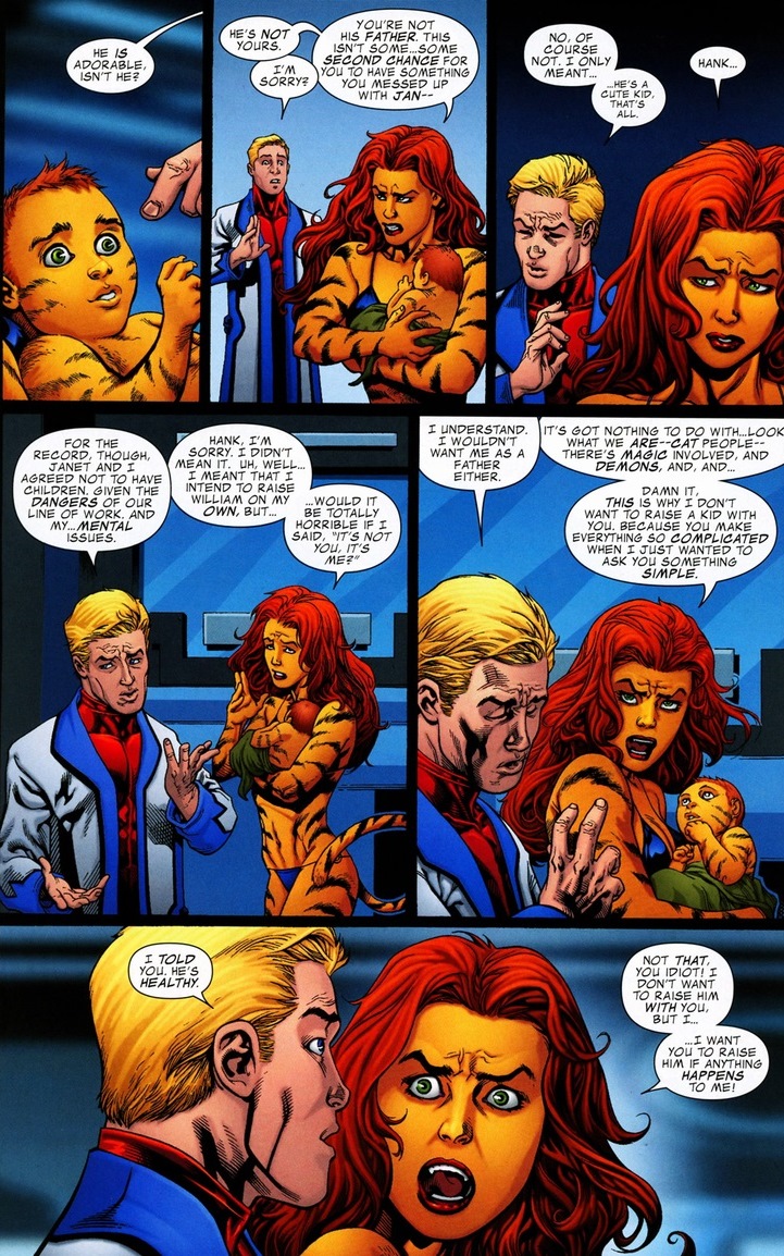Now, this whole paternity thing tends to be confusing when aliens and ancient cat people get involved. Yes, Tigra loved Giant Man in the past, but that was a Skrull and not the actual Giant Man. The impostor impregnated Tigra, but since Skrull shapeshifting takes place at a genetic level — the child has Pym’s DNA. Which means Giant Man’s the dad, but not the father.