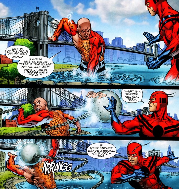 Right? Classic soap opera drama! Allow me to introduce Sandy Hawkins (superhero name Sand — who, as you figure, controls sand). He currently leads the JSA, which I guess makes for a lapse of leadership when making out with the girl Hawkman claimed dibs on. The same man known for his short temper and weapon with spikes.