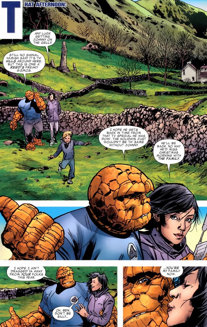 If Ben loses his temper, which happens far more often than comfortable, the damage he can cause could be catastrophic. How can Deb feel safe around that? Well, I assume the continuing declaration of Ben’s love for her certainly helps. That and despite everything I’ve just said, the Thing’s a gentle giant — after all, the Thing does live with Reed and Sue’s two young children, who adore him above all else. We as readers can suspend our disbelief that cosmic rays turned the Thing into an orange rock monster, but we would never buy that he’d actually hurt the people he cares about. Which is also the same reason the next scene has to happen.