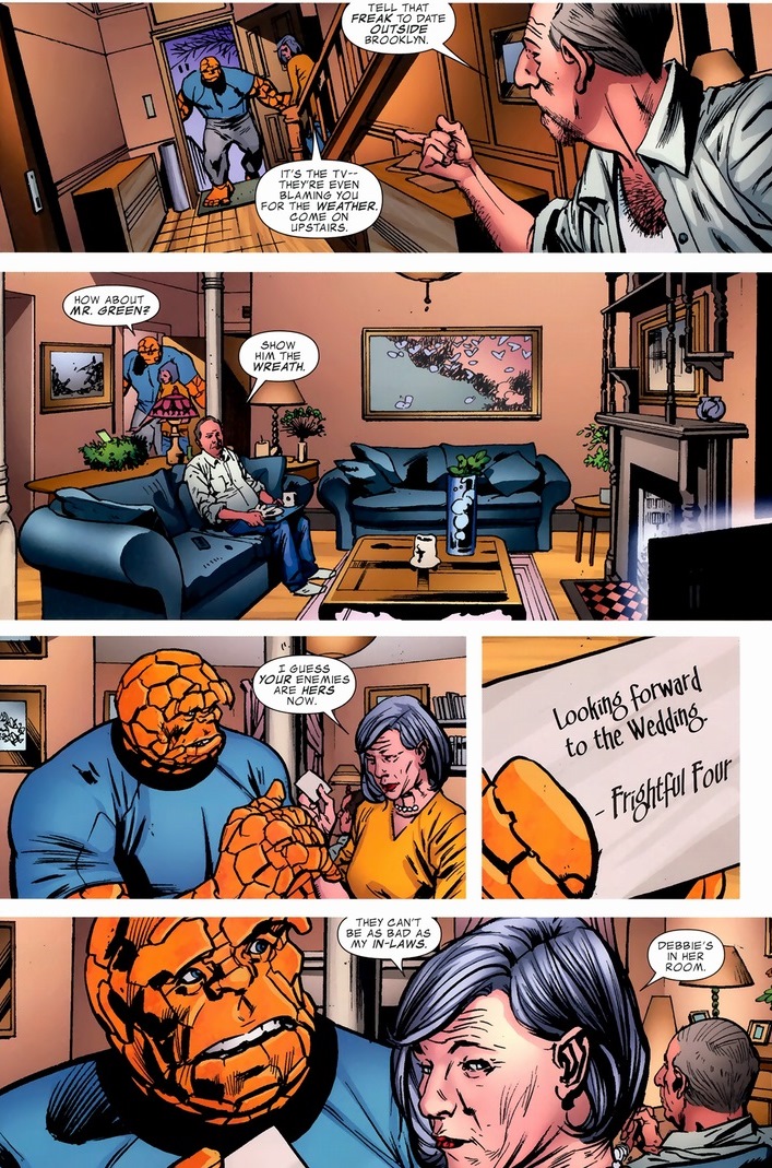 I want to believe this scene happened for two reasons. First, to showcase Deb as not just another supporting character — as in who cares that the Thing’s marrying some ordinary girl? Well, there’s a strength within her that normal ladies don’t possess, and it’s that strength that attracted the Thing to her in the first place. Probably. More importantly, have you realized the Thing doesn’t wear shoes? Like ever? Even on television shows?