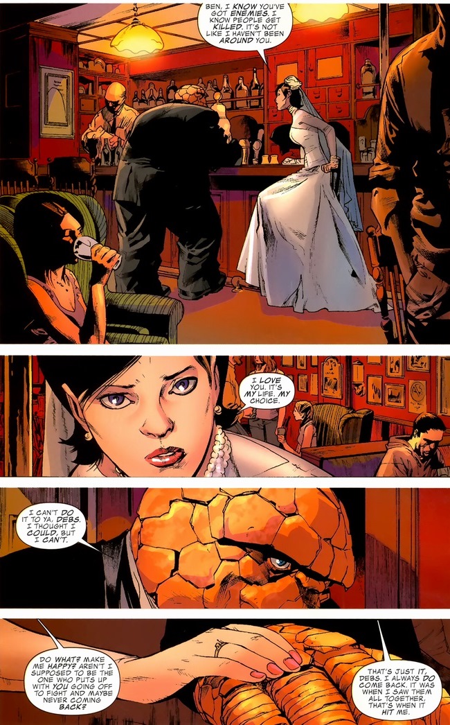 Posted: 07/07/2013 Filed under: Marvel, Relationships 3 CommentsWhen we left off on Friday, the Thing (Ben Grimm) and Deb Green just got engaged. Happiness ensues, and the two begin to plan the rest of their life together. A rare happy ending in the plethora of superhero tragedy.