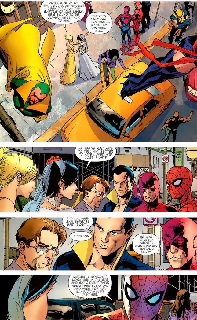 Mr. Fantastic’s marriage is fine. Sort of. Now, the Fantastic Four have a unique position in the superhero world. Think of the team as a business. They possess no secret identities and the Baxter Building (where they live) is well-known and prominent in the New York skyline. Reed supports the family through government contracts and patents while occasionally taking a break to defeat Galactus or whatever. None of them are public menaces. I’m just saying Spider-Man waltz into a school.