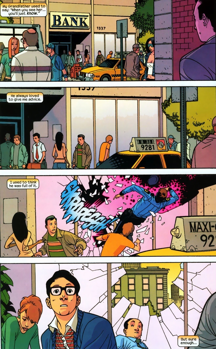 A man trapped in an ongoing bank robbery witnesses the girl of his dreams. No better way to tell your grandkids how you met than during a traumatic bonding experience. I’m a big fan of blossoming love, especially in comics.