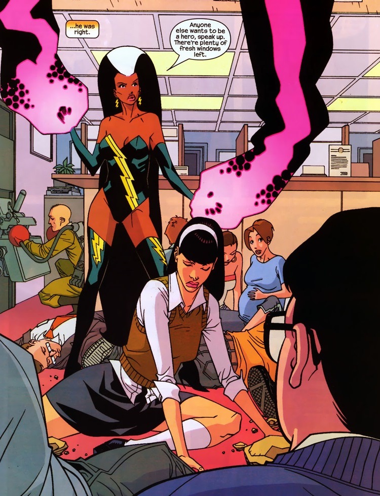 I just realized that without the next page, Wolverine sounds like he’s about to, er, terminate the pregnancy. Instead, he’s taking out the radiation pill that hinders her healing factor. I aim to be non-controversial.