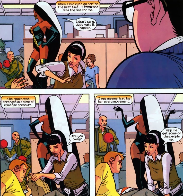 Posted: 09/12/2013 Filed under: Marvel, Relationships 3 CommentsI get distracted when I find a good Hercules story, like the one I showed last time. We’ll get back to our Spider-Man articles on Monday (especially because I haven’t actually shown a story starring Spider-Man yet), but as you end your week working diligently for The Man, relax and be delighted with this little love story from X-Men: To Serve and Protect #4, written by James Asmus and drawn by Eric Koda, Sandu Florea, & Miguel Munera.