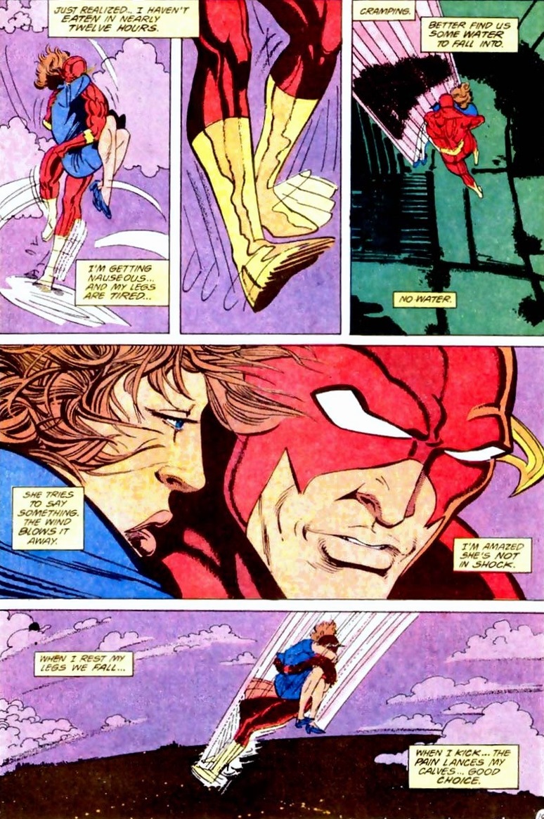 I know I’m making fun of this whole situation, but despite being fictional, this is some hardcore heroism we’re witnessing here. The reason I chose this issue to highlight is just how out of his element the Flash is here, yet he shows no hesitation or fear. Freeze guns and boomerangs? Those he can handle no problem. But knowing that he would be falling full force towards the Earth with nothing to protect him or slow him down but violently kicking his legs — he does it. No hesitation. No fear. Remember, superheroes are better than us in every way.