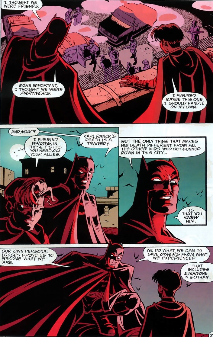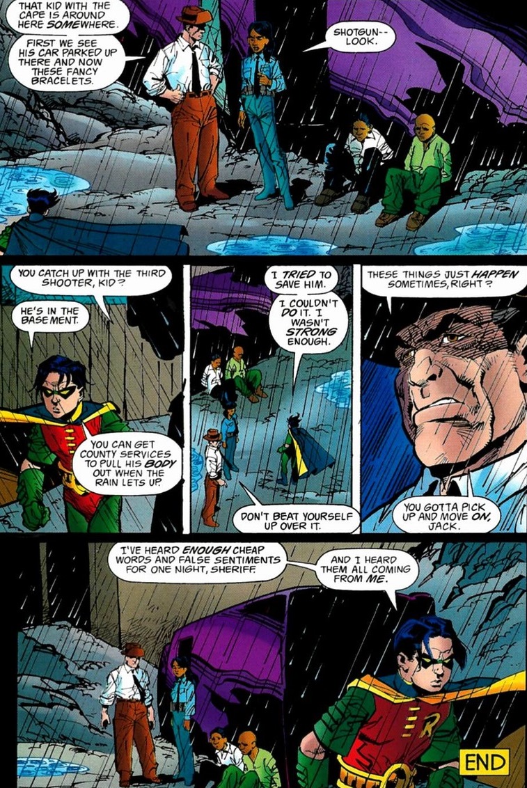 Why is this moment so upsetting compared to the rest of Robin’s career? Batman’s partner has seen hordes of dudes gunned down, women and children horribly killed, and the absolute core of Gotham’s evil. So why one dumb bully from his school? Simple: