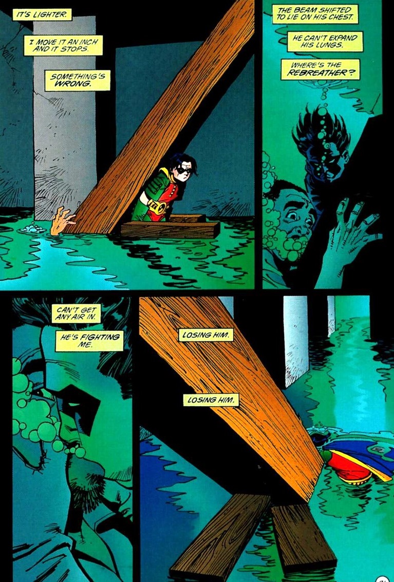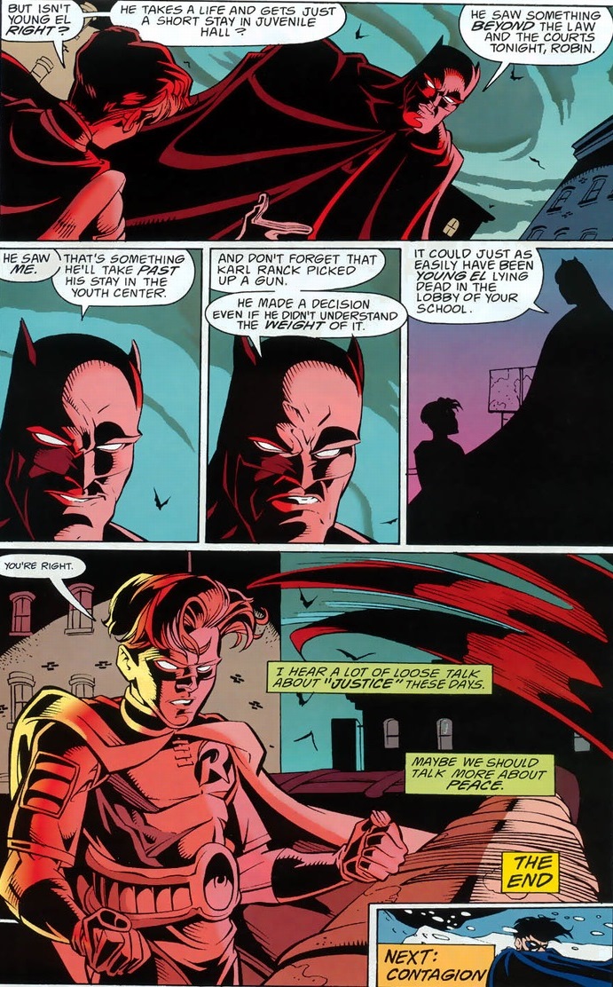 See? What a great dilemma! Young El will need Robin’s help to survive his mistake, but Robin will be assisting a known murderer — and a personal tragedy in Tim Drake’s life — only to have Young El break the law later down the road again. While people rave about characters who “put down” their villains, of course Robin’s going to attempt to save Young El. He’s better than us. Batman’s better than us. Superheroes have to be morally superior, as it goes with the cape-and-underpants territory.