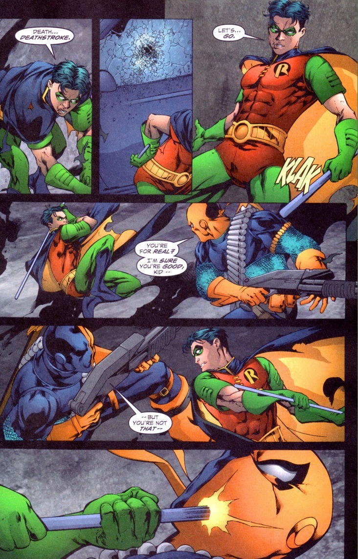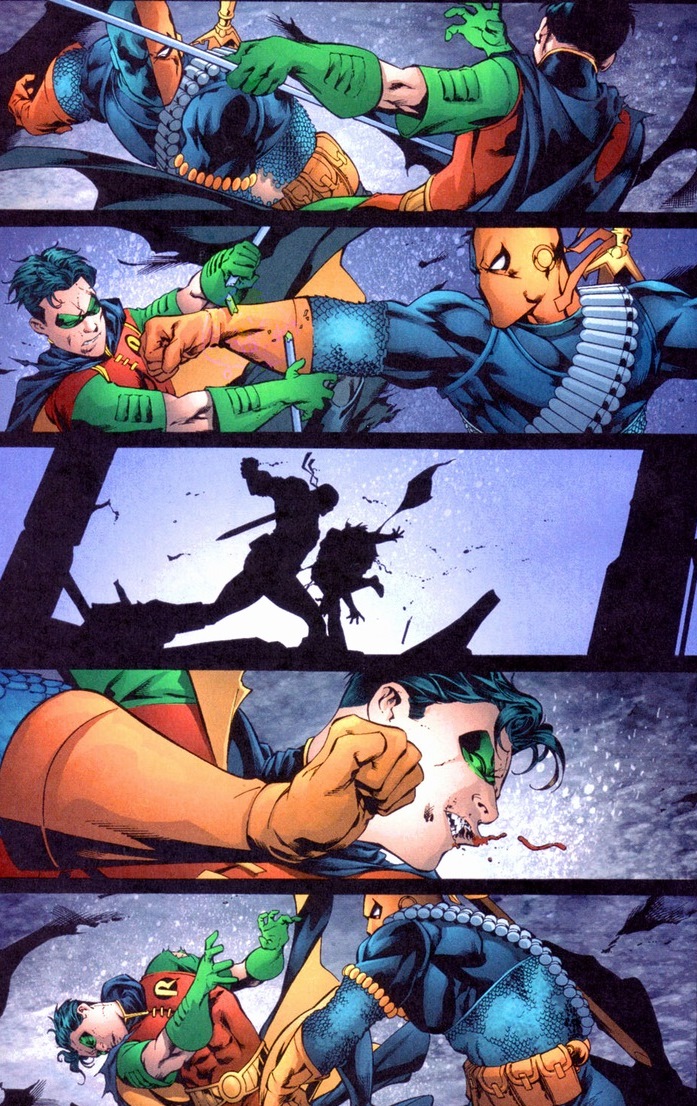 Posted: 07/02/2014 Filed under: Characters, DC 4 CommentsBeing a superhero, Robin has an advantage that normal people don’t — namely superhuman detective skills and kung fu-ing faces. With his classmate dead, it’s time the teenage murderer pays for his crimes. Through kung fu-ing him in the face, mainly. Robin and his buddy Spoiler have all the information they need, and all that’s left is the bruising and the arresting.