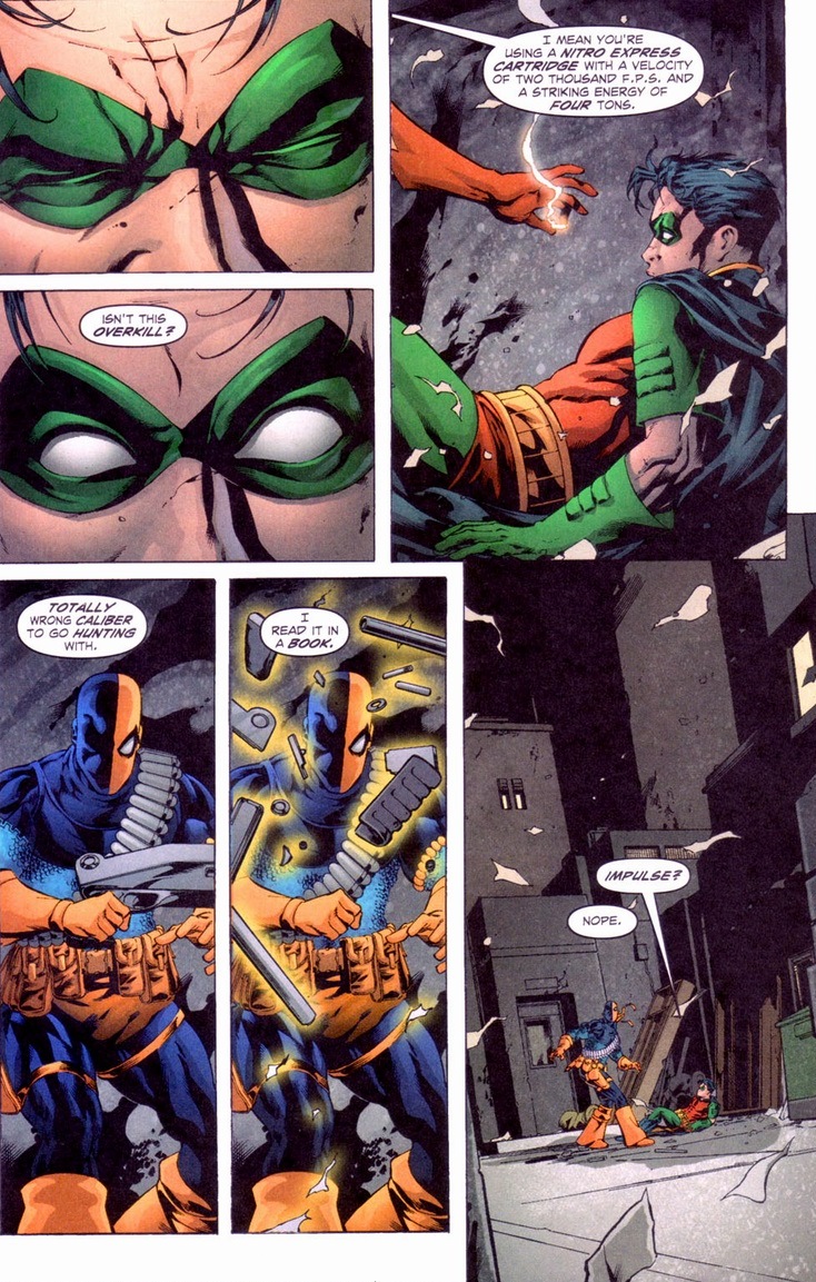 Robin solos Deathstroke next. And as I’m a former English teacher, I’d be remiss not to mention that for all of Robin’s skills — martial arts, detective logic, weapon training, years of on-the-job experience, and a costume full of Deus Ex Machina gadgets — his life today gets saved because of books. Beautiful, glorious, spectacular books.