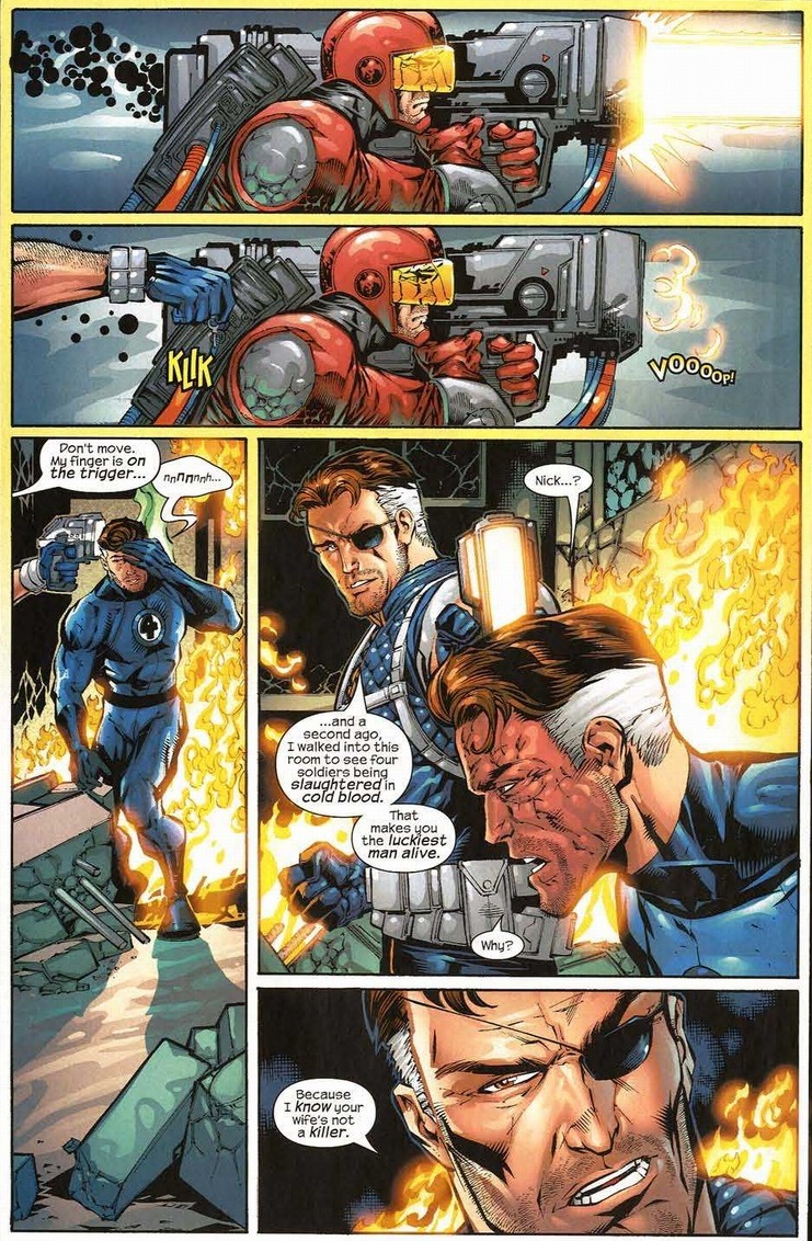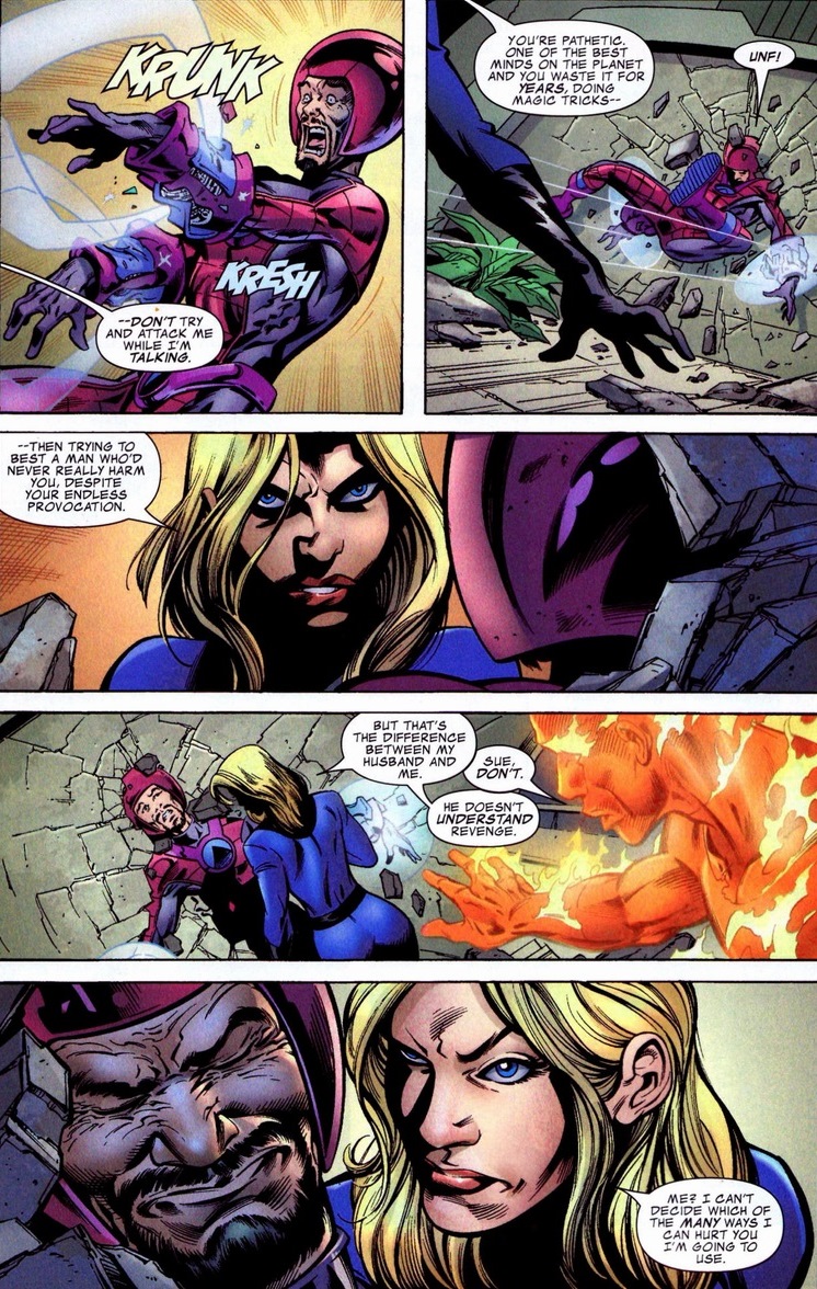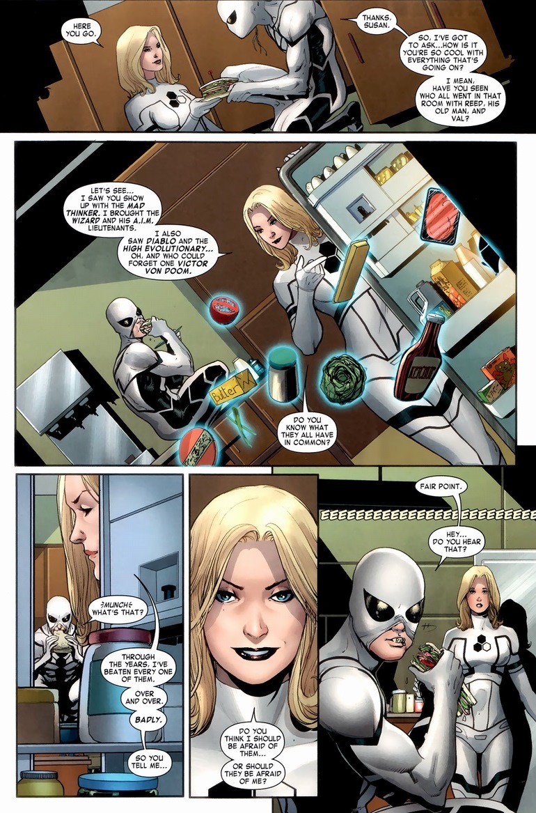 Y’see, a sci-fi obsession aside, Reed’s not entirely lying about doing this to protect Sue. During the huge final fight at the conclusion of Civil War — the fight where Captain America surrenders after a horde of civilians rush into a superpowered battle zone to tackle the captain — Mr. Fantastic makes good on his proclamation. And then Sue wrecks Taskmaster.