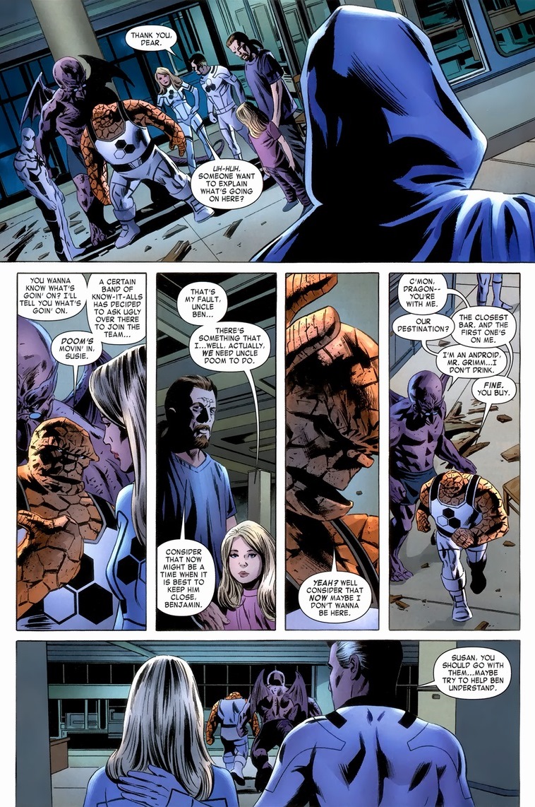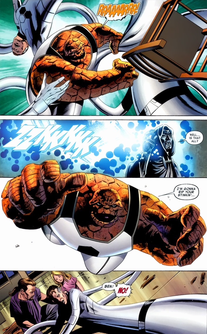 We end today (mainly because the NyQuil is starting to kick in) with scenes from FF #2-4, written by Hickman and drawn by Kitson & Steve Epting. To sum up recent events, a group of several dozen alternative dimension evil Mr. Fantastics are attempting to destroy Earth. So to solve this problem, our good Mr. Fantastic gathers up a whole collection of supervillains to discuss debate-style possible methods to kill Mr. Fantastics. It’s a genius idea, and any successful Mr. Fantastic-killing council needs the big baddie himself: our pal Doom. You know who’s not happy with this? Everyone. Especially Thing who still hasn’t really gotten over the Human Torch’s death recently.