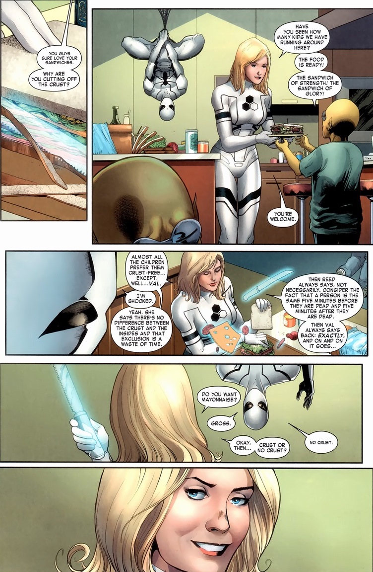 Make the best of a bad situation, I guess. Every time I forget why Namor’s infatuated with Mr. Fantastic’s wife, I always find a scene to remind me. Namor may smell like tuna and soak whatever rug he stands on, but I would never stop pursuing the Invisible Woman too if I were him.