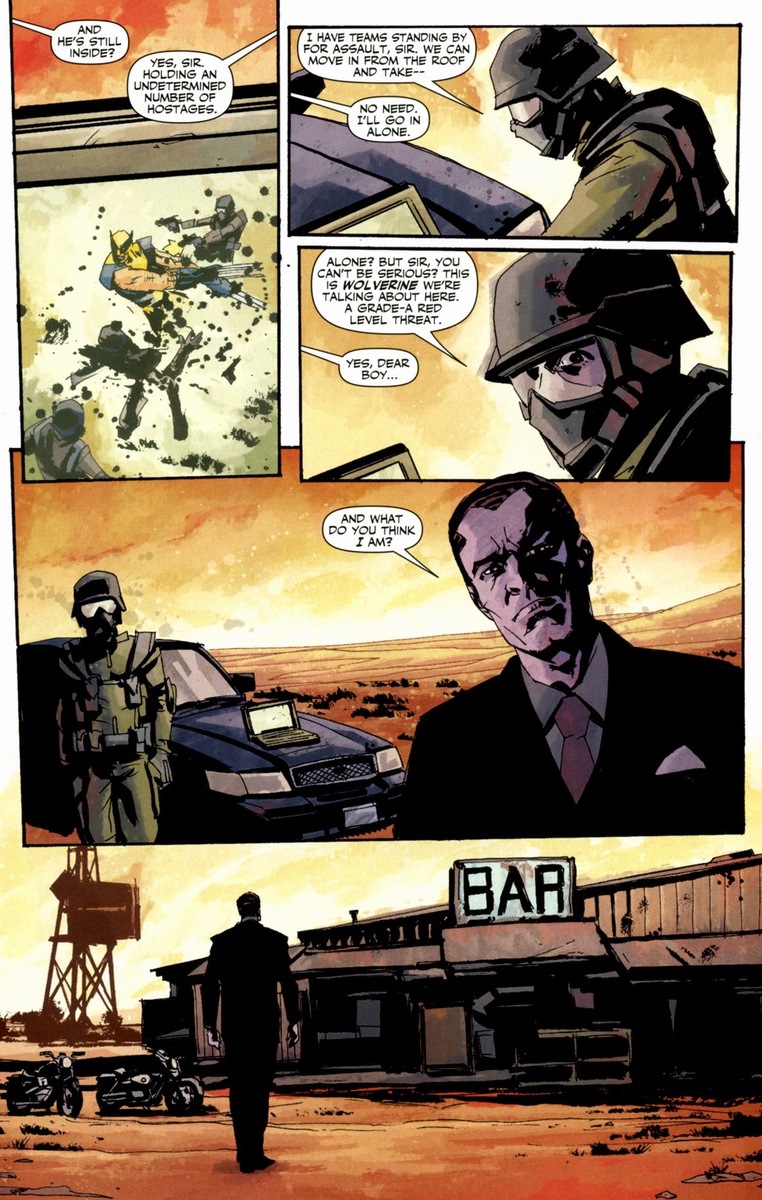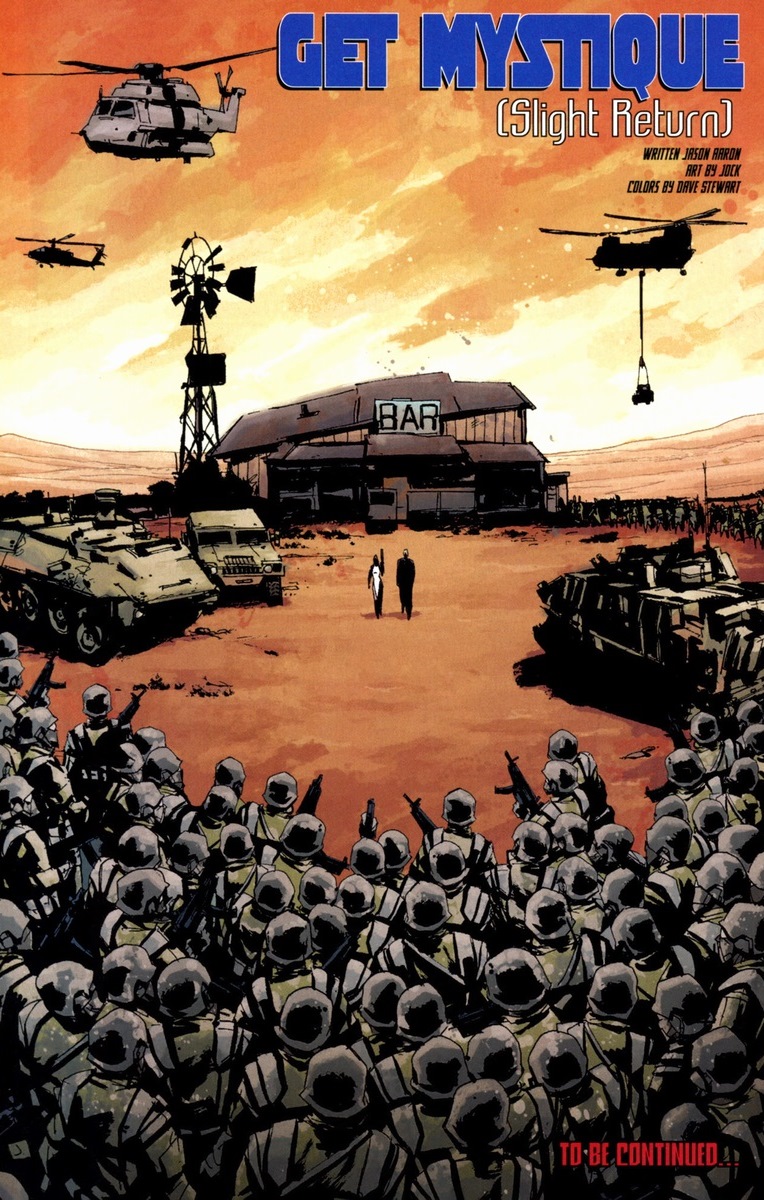 Posted: 05/01/2014 Filed under: Characters, Marvel 2 CommentsNorman Osborn’s X-Men team completes its roster today — a team assembled full of morally ambiguous, lied to, and unwillingly-forced-into-servitude superheroes/supervillains. The full group led by Emma Frost consists of Namor, Mimic, Dark Beast, Cloak, Dagger, Weapon Omega, Daken, and finally our wildly unpredictable shapeshifter Mystique. Y’see, recently Wolverine and Mystique settled some differences (bloody, explosive differences) and the encounter left Mystique dying and abandoned in the desert. She survived. Let’s not worry about how. Now that she’s unemployed, Osborn figures she could use a gig obeying his every command as part of his pseudo-PR-stunt X-Men. At least he doesn’t have to manipulate Mystique — there’s a respect/open rudeness between supervillains of their caliber. Today, we’ll take a look at a scene from Dark X-Men #3, written by Jason Aaron and drawn by Jock.