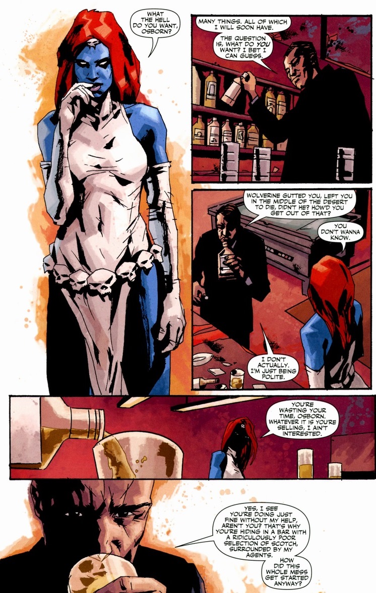 It’s almost impressive how long Osborn held onto his sanity during Dark Reign. The dude handled nonstop problems and issues — the same issues that undid Iron Man’s rule — and yet until Siege he never reverted into his Green Goblin crazy pumpkin-chucking persona he triggers as quickly as stepping on Bruce Banner’s foot turns him into the Hulk. Well, I don’t think he Green Goblin’d publicly. I mean, not around cameras and stuff. So Mystique, who battles foes mainly by immediately detecting and hitting all the right emotional nerves, now gets to argue with a man as uncaring and vindictive as herself. In a sick way, it’s refreshing to see a completely honest Osborn.