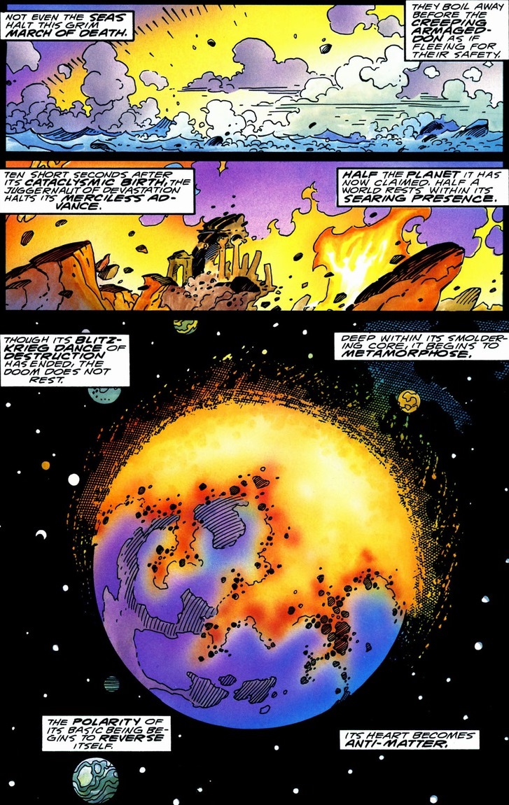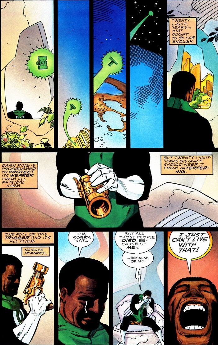 The planet’s death scene lasts for seven pages. It’s wildly melodramatic, fairly poetic, and I’m going to show it to you in its entirety uninterrupted. While Green Lantern’s no longer fear the color yellow (or in Alan Scott’s case, wood), this blow to the conscience’ll last for the rest of Stewart’s life. My goodness, get ready for some emotional brutality. Oh, and remember that scene in Justice League Unlimited where Lex Luthor — possessing Flash’s body — defeats Green Lantern with a well-placed throw of banana pudding? Some superhero weakness can be really silly.