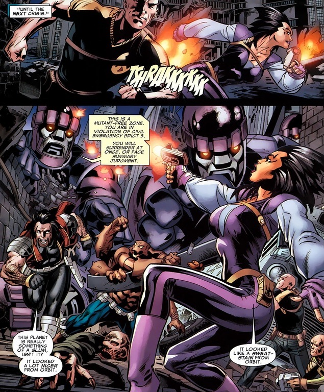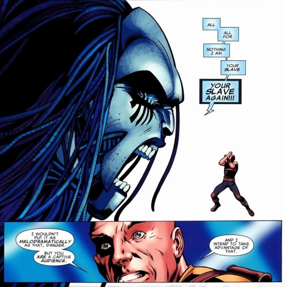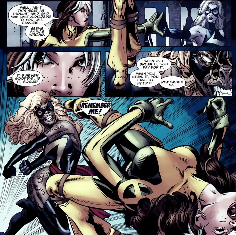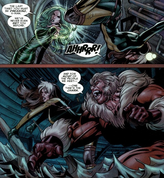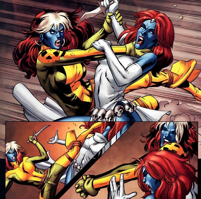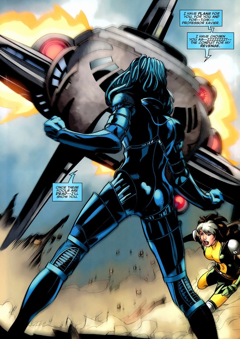 In a weird twist, Mystique possesses Rogue’s mind as a motivational figment of her imagination. This arc is strange. Lots of crazy stuff. Like this: