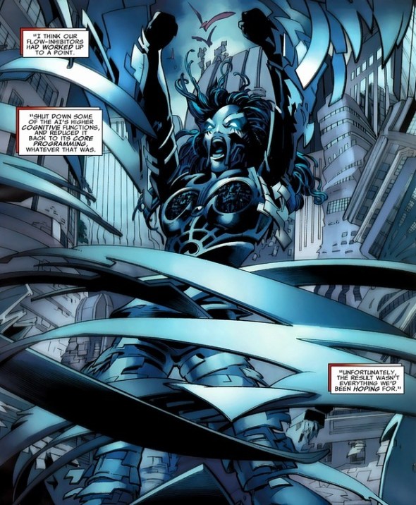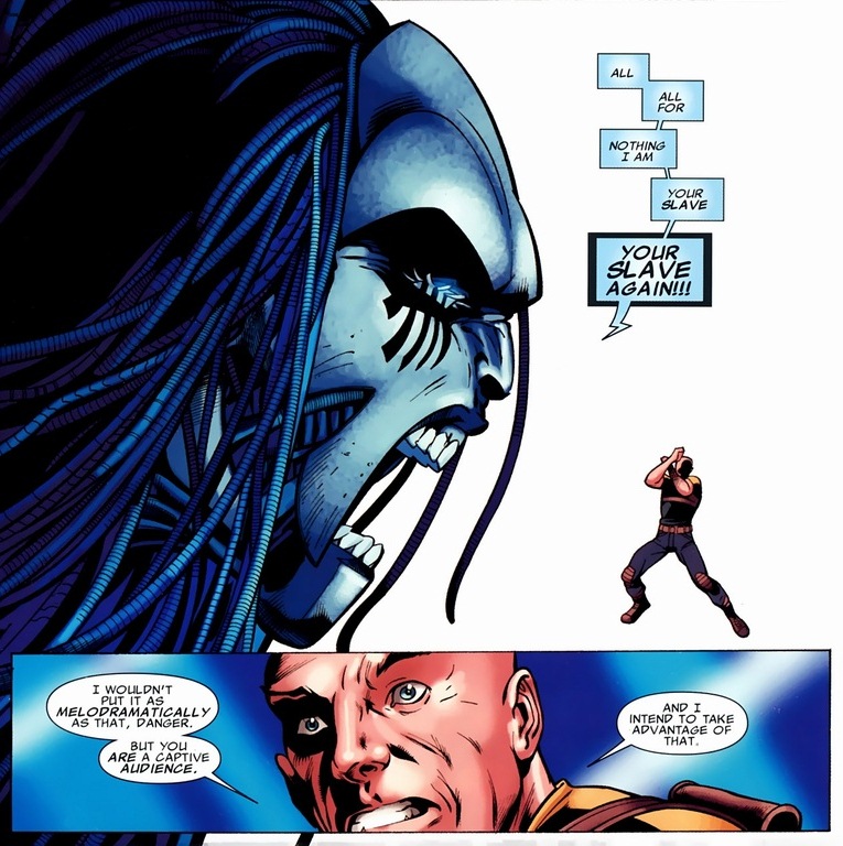 Danger, the actual robotic manifestation of the former X-Men Mansion’s Danger Room and now a powerful supervillain, ambushes poor Rogue while an alien spaceship filled with jolly pirates or something launches a simultaneous attack. Can’t really meditate through this mess.
