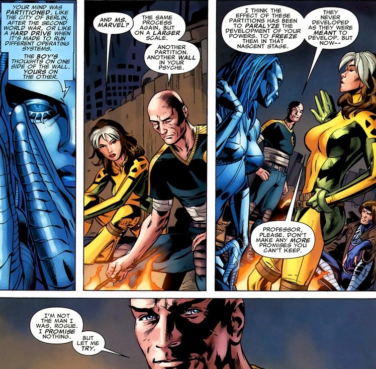 Victory! As delightful as a march through the fantasy land can be, that’s not enough for me to write an article about. With Rogue found, Professor X has one final bit of redemption to do. Y’see, to get Rogue to join the X-Men in the first place, Xavier lied and told Rogue he could cure her (that power that drains life from everyone she touches). He could not. He knew he could not. Now with Danger’s help, Professor X found the solution. Only a decade or two of emotional misery later.