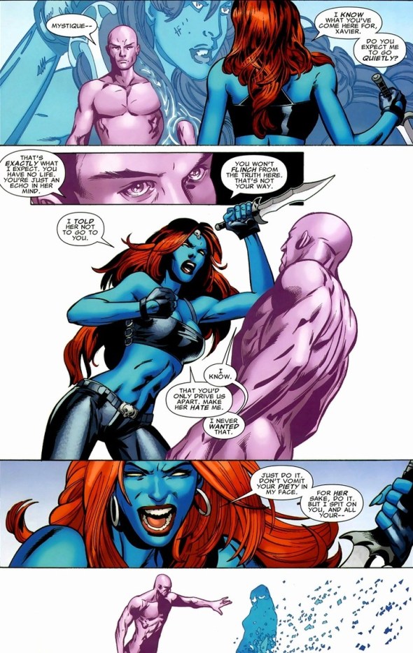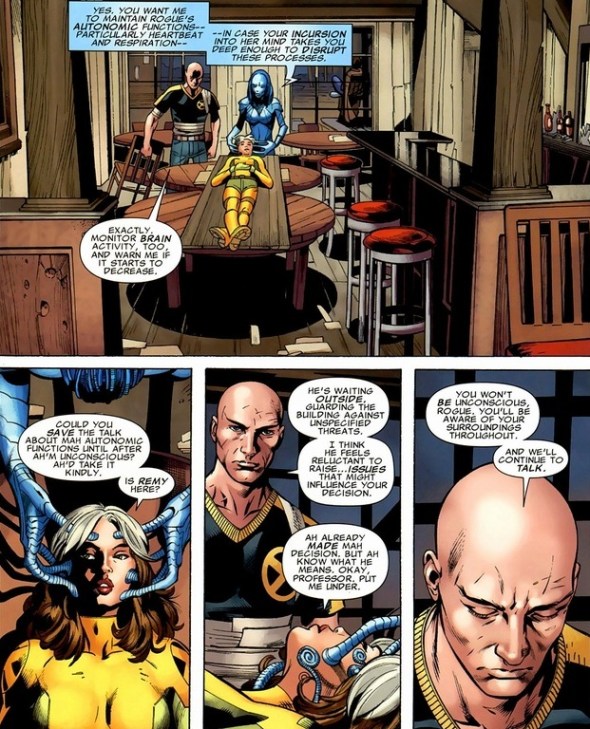 I just think the scene would still be just as awesome if Professor X wore underwear. Still, with the fake Mystique purged from Rogue’s psyche, has she overcome her instinctual powers and transformed them into the on-off switch she always dreamed?