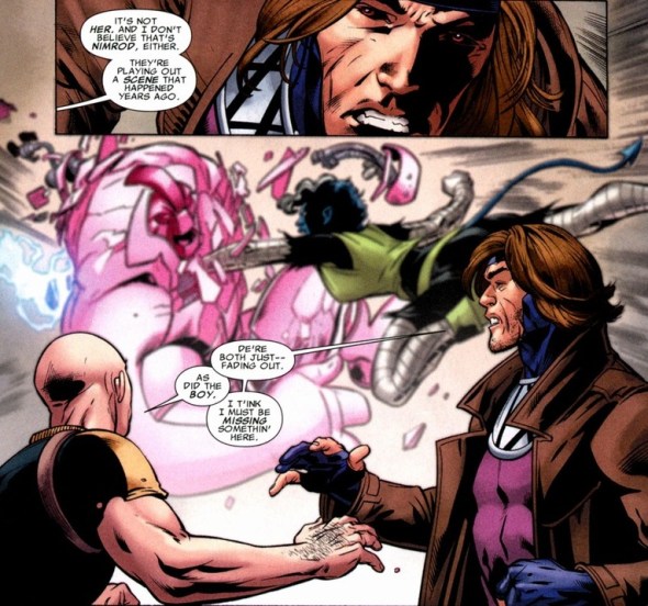 Gambit’s been traveling with the professor for a few issues now. Being one step from hobo, Gambit doesn’t have a busy schedule. So when Rogue disappeared a while ago, Professor X figured he could kill two birds with one stone. And where is she?