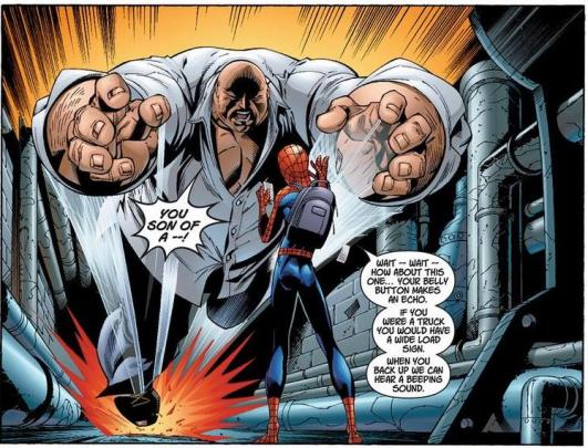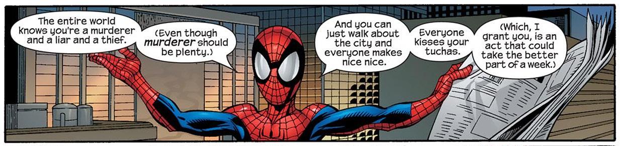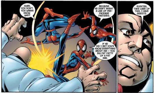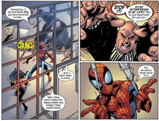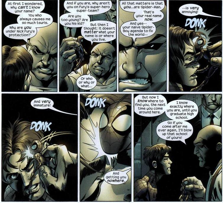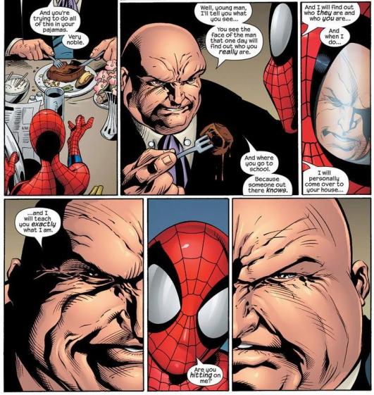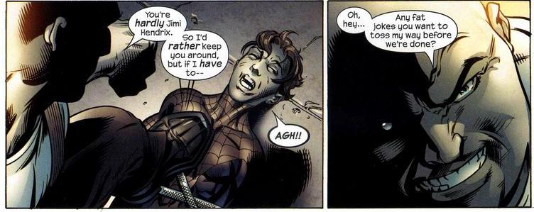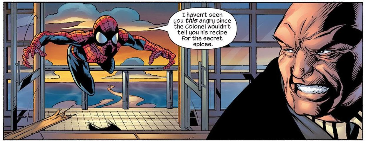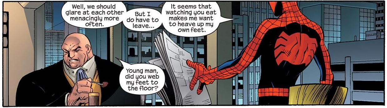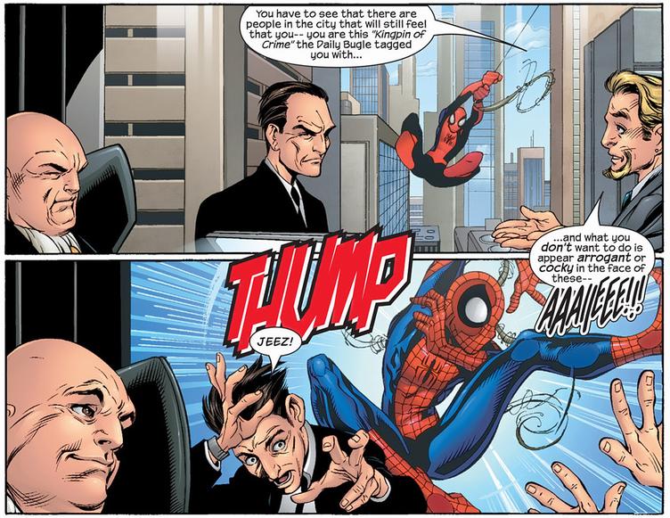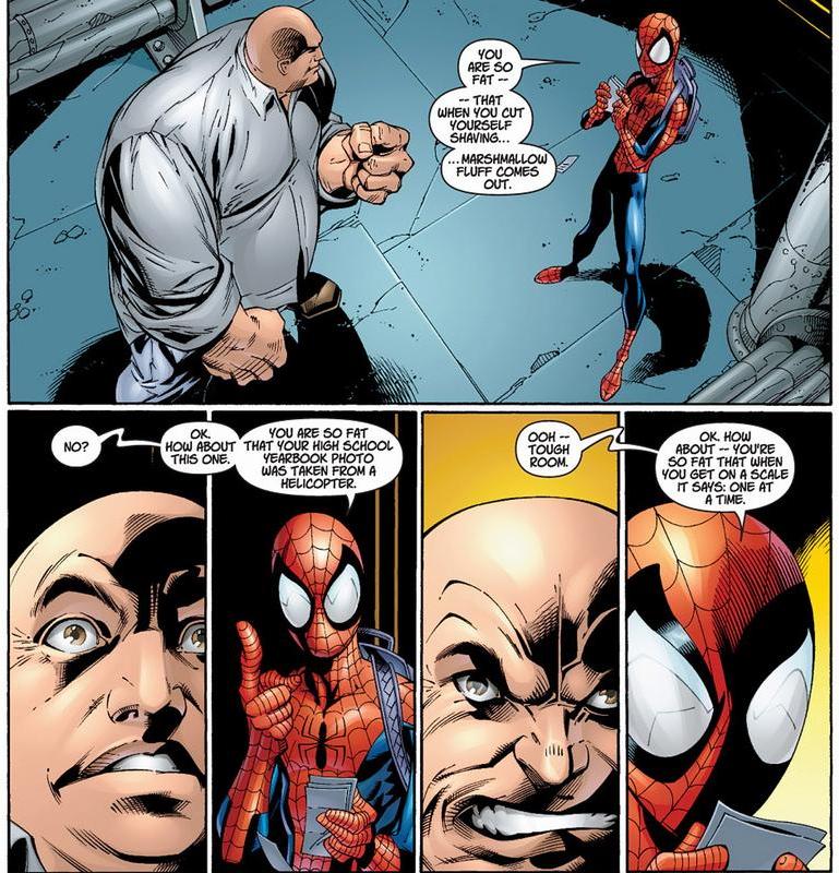 In the Ultimate line, it’s Spider-Man who clashes with The Kingpin most often. And despite The Kingpin being a ruthless, remorseless murderer, Peter Parker is downright cruel to him. Words can sometimes hurt more than fists, buddy.