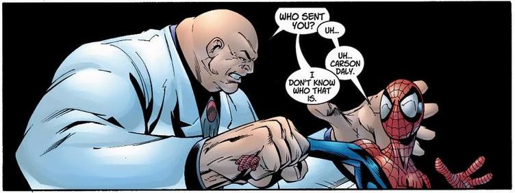 So how does a normal dude stop a superhero? Well, connections certainly help. Which makes their dynamic one of the finest and most complex in the Marvel universe. Why do superheroes have secret identities in the first place? The most common answer is to protect their loved ones from amoral baddies. So how do you create a setting where both Spider-Man and The Kingpin have equal leeway over the other? Well, eliminate the secret identity and the jokes slowly starts to disappear. Now the power struggle goes from this: