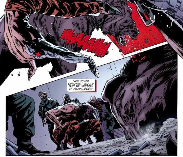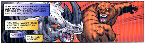 Even the Invisible Woman a few panels back made a crack at Ursa Major, and she’s a loving mother of two. Thankfully, he and the Winter Guard are still alive and well, still fighting Russia’s enemies, and still available as a foil for any superhero who needs to pound the forest king.
